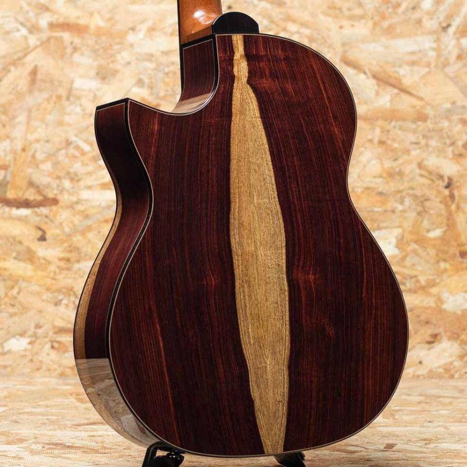 トップ材には、向江氏が独立の際に師であるサーゲ氏より譲り受けた思い入れ深いジャーマンスプルースを使用。サイド&バックには、印象的なサップを含むマスターグレードのアマゾンローズウッドを採用しています。