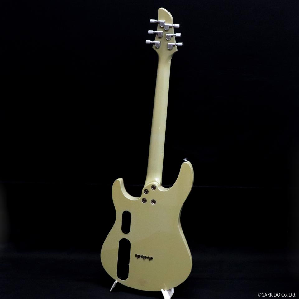 特徴的なボディ構造は勿論、VolノブにLEDが仕込まれていたり、円柱型ペグの採用など、個性の際立つ仕様のギターです。
