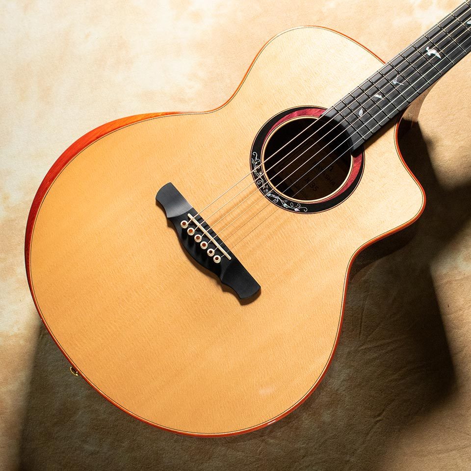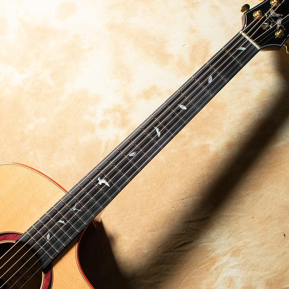 JCラインの上級モデル。特徴はエルボーコンツアーと呼ばれる、右腕がギターに当たる部分をラウンドさせたデザイン。角を落とした形状なので、腕の当たりが痛くなく、プレイヤビリティの向上にも一役買っています。材料も一段と厳選されたものとなり、トップにはシトカ・スプルース単板、バック&サイドには貴重なインディアン・ローズウッド単板が使用されています。鳥をモチーフにしたインレイはアヴァロン貝を使用。