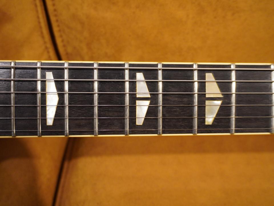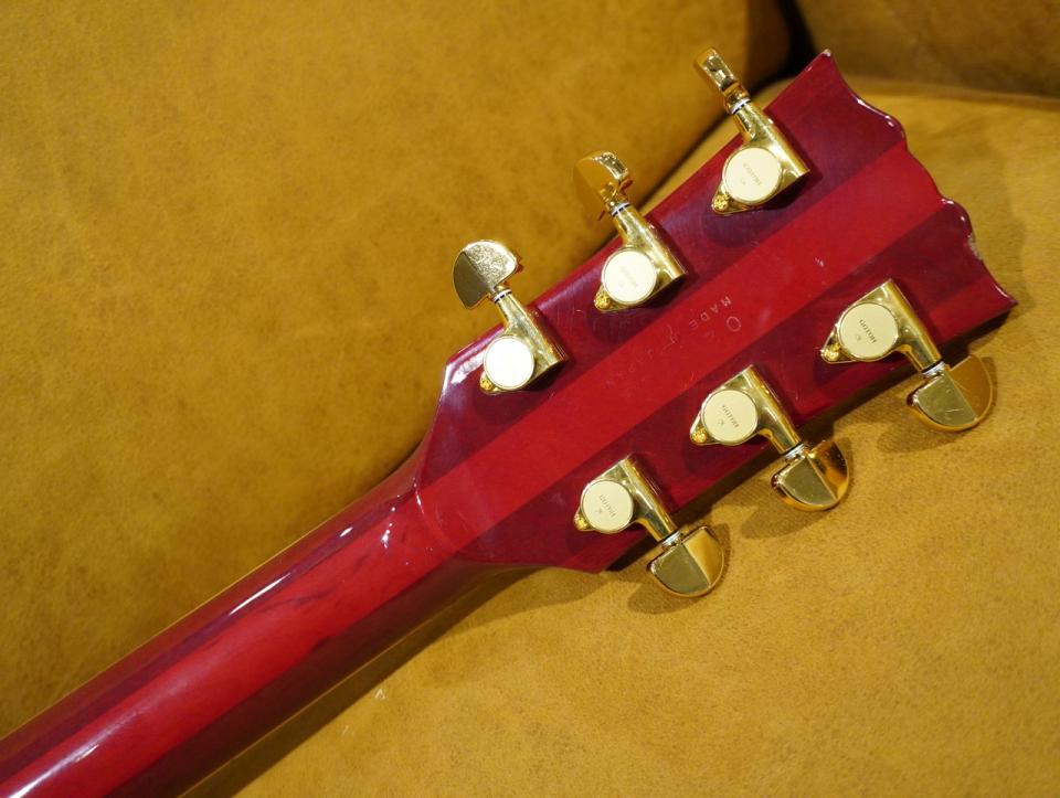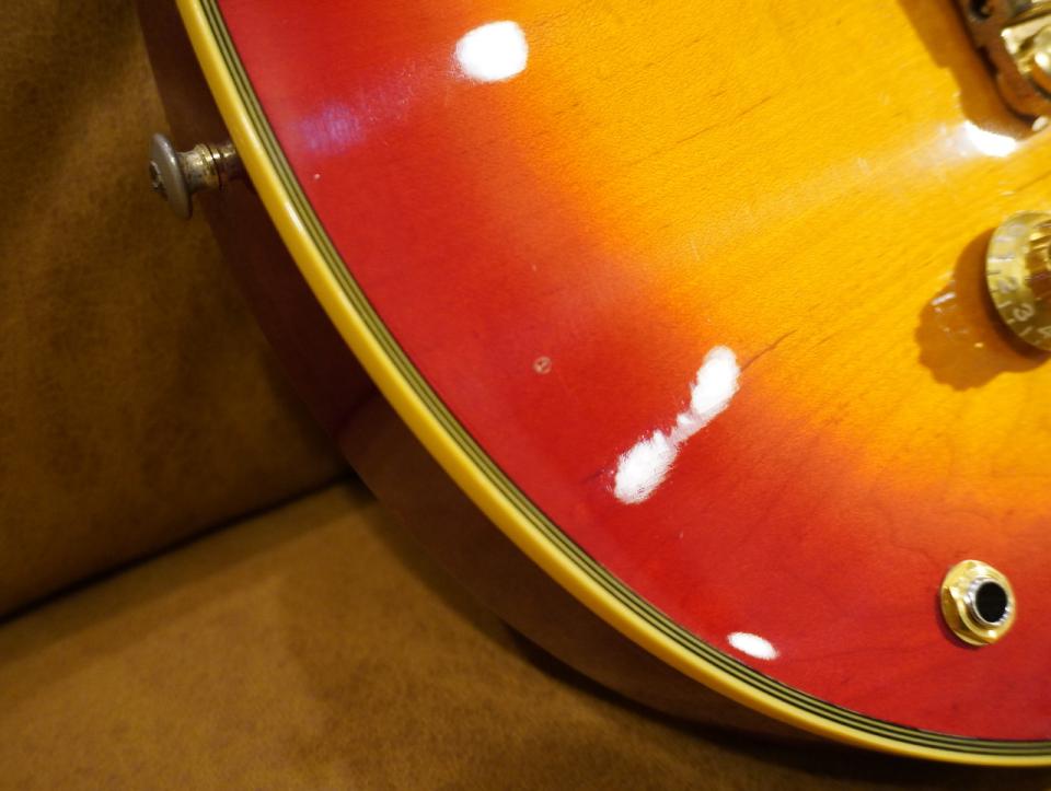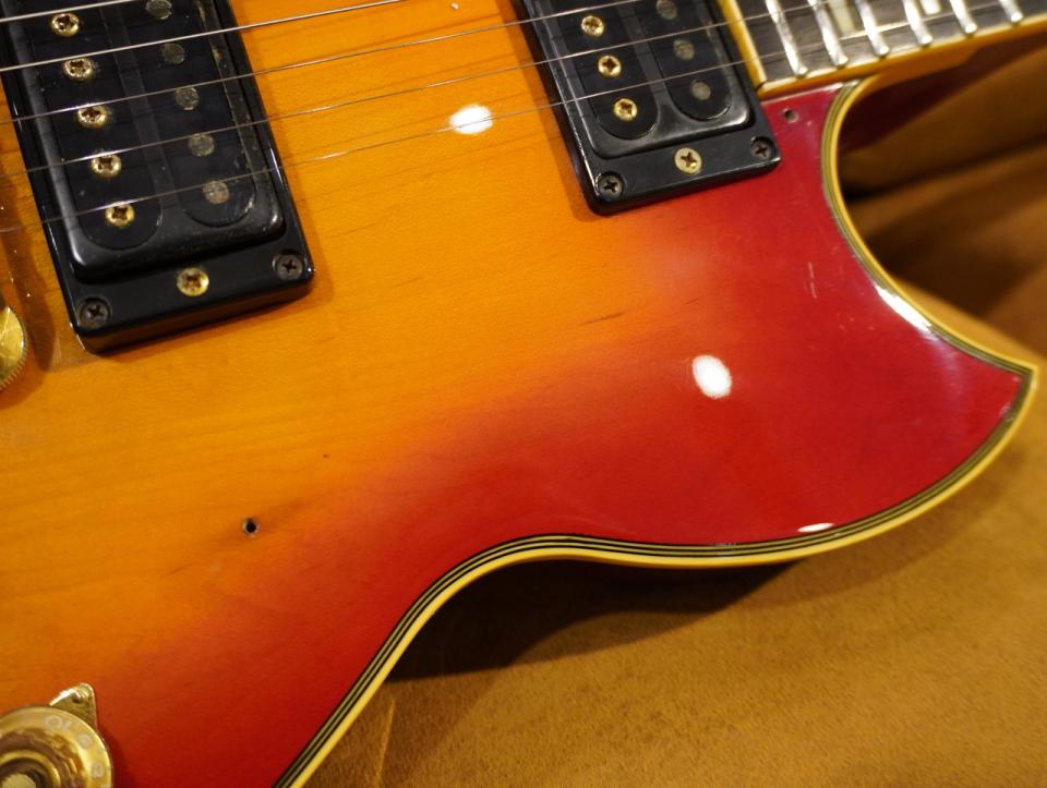 外観はトップにいくつか打痕があります。ゴールドパーツにはくすみが見られます。バックには無数の打痕がみられます。バックから見て右側のホーン部先端にカケがあります。ピックガード取付跡はありますが、ピックガードは付属していません。