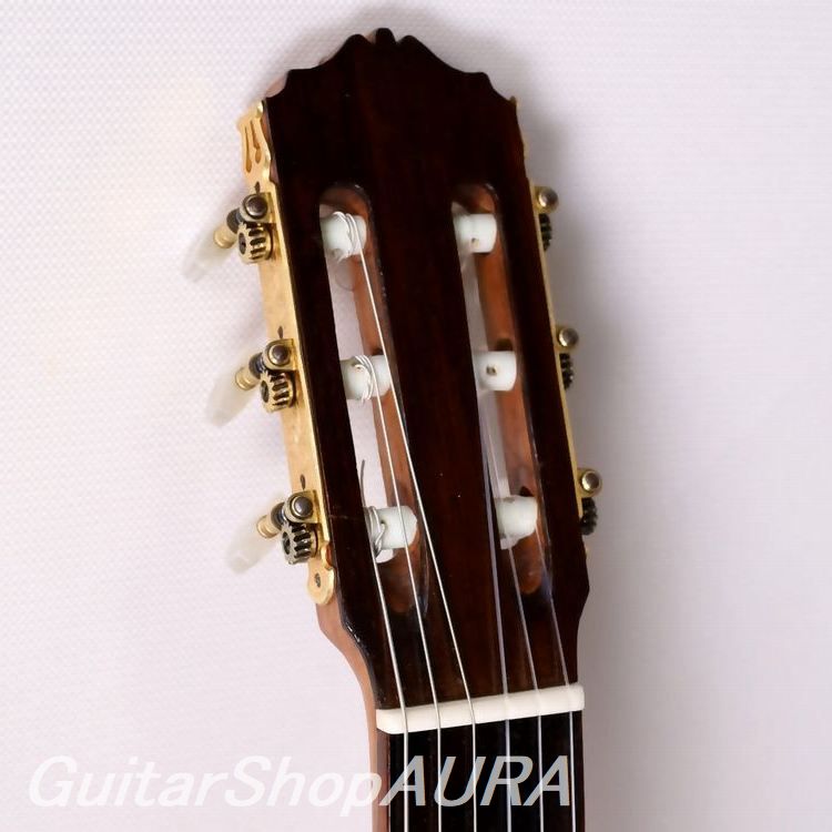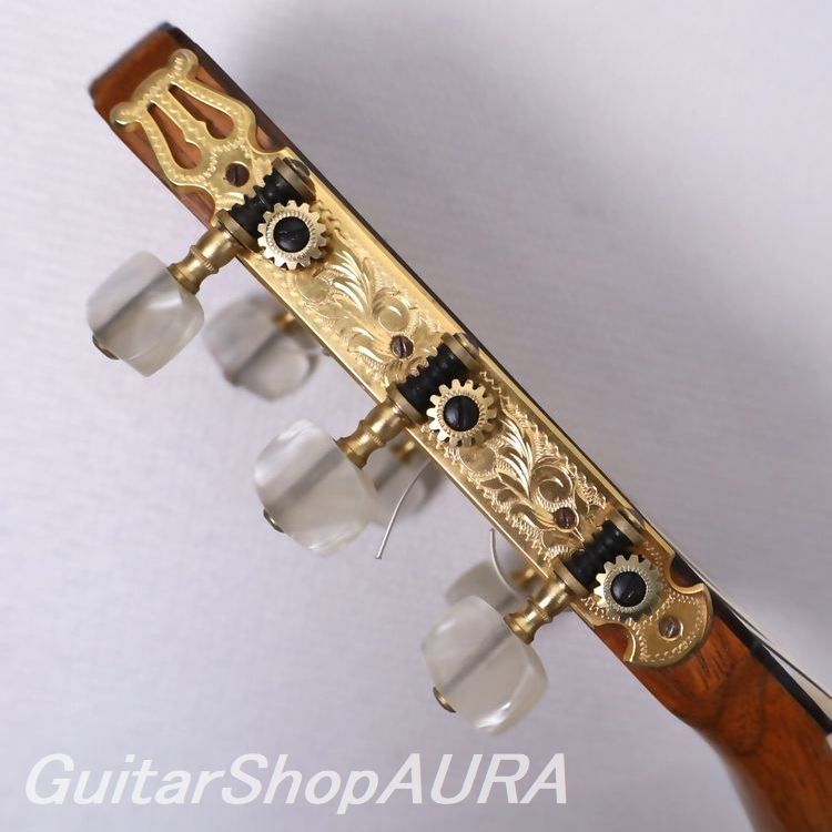 The tuning machines have been replaced with a Fustero (Ramírez-style) set. The plates extend slightly (approx. 1 mm) beyond the wood edge, though not detracting significantly from the appearance.