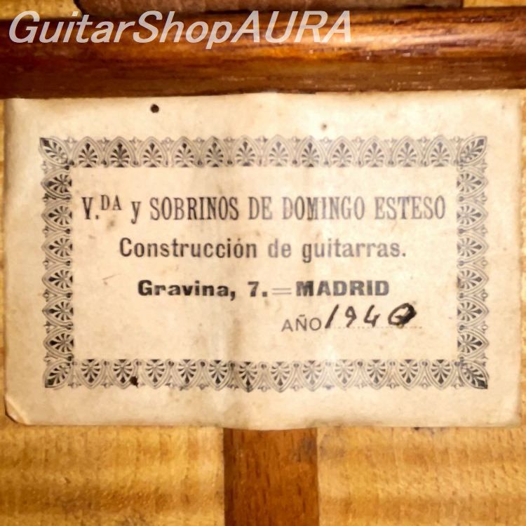 The label “Viuda y Sobrinos de Domingo Esteso” (“Widow and Nephews of Domingo Esteso”) was used following the death of the renowned Madrid luthier Domingo Esteso (1882–1937). It signifies instruments completed after his passing, in practice built by his nephews—Faustino Conde (1913–1988) and his brothers Mariano (1916–1989) and Julio (1918–1995).