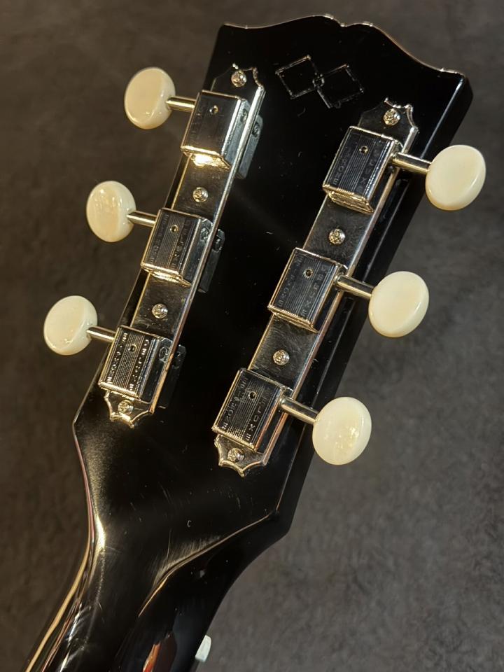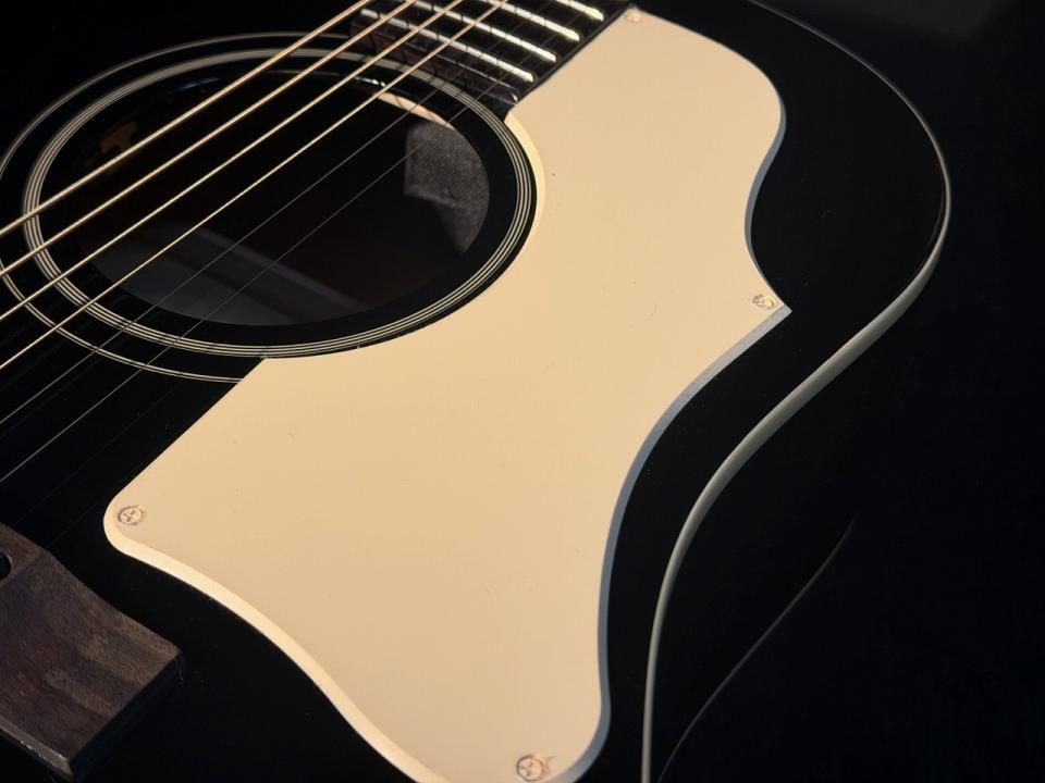 Gibson製品と同形状のヘッドストック、アイボリーカラーのラージピックガードにはビンテージ仕様4点止めネジを再現(ダミー)。ペグボタン&バインディングも同じくアイボリーカラーでヴィンテージテイストを演出しています。ボトムベリーブリッジの上にはローズウッドサドルを見立てたブラックタスクサドルを直付けし、氏の愛用する1968年製仕様に近付けています。L.R.Baggs社製アンダーサドルピエゾピックアップがプレインストールされ、ネックエンドにはストラップピンがセッティングされておりますので即ライブでの使用が可能です!