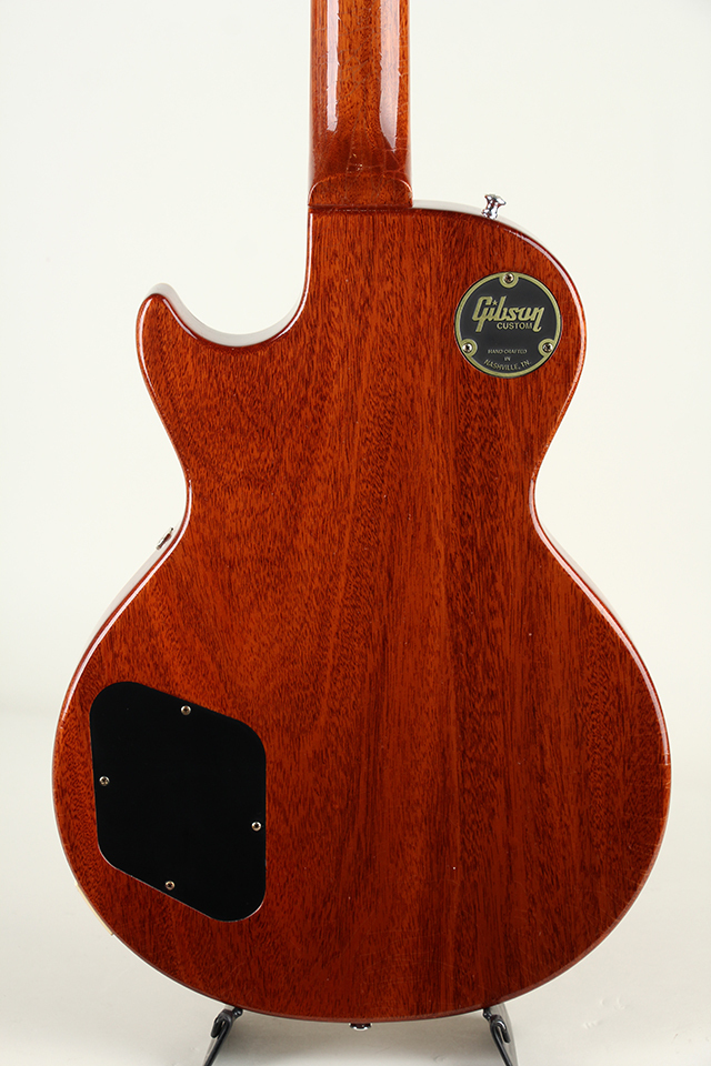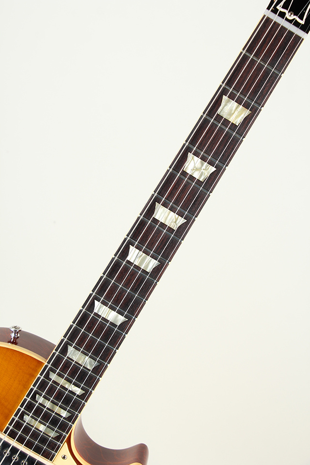 通常はプレーントップ仕様の58モデルですが、当機は杢目のあらわれた Lightly Figured Mapleが採用されております。近年リファインされたより当時に近いヘッドトップの“Gibson”&“Les Paul”ロゴ、指板のディッシュインレイ素材の色味、サーキット内のポットやバンブルビーコンデンサーもビンテージライクな仕様が採用。オールニカワ接着やトゥルーヒストリックパーツ採用の等の基本仕様も、勿論継承されております。ネックグリップはAuthentic '59 Medium C-Shapeを採用、フレットも59タイプとなっており、演奏面は59仕様です。