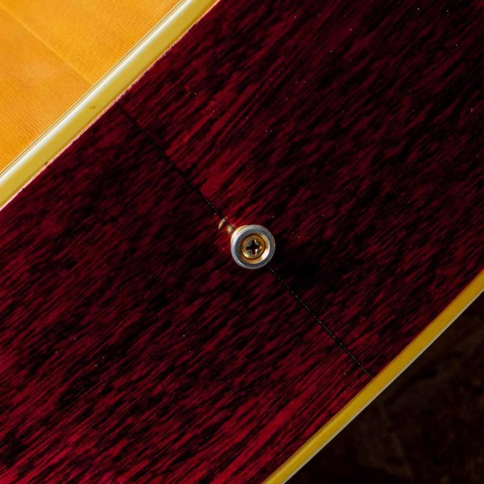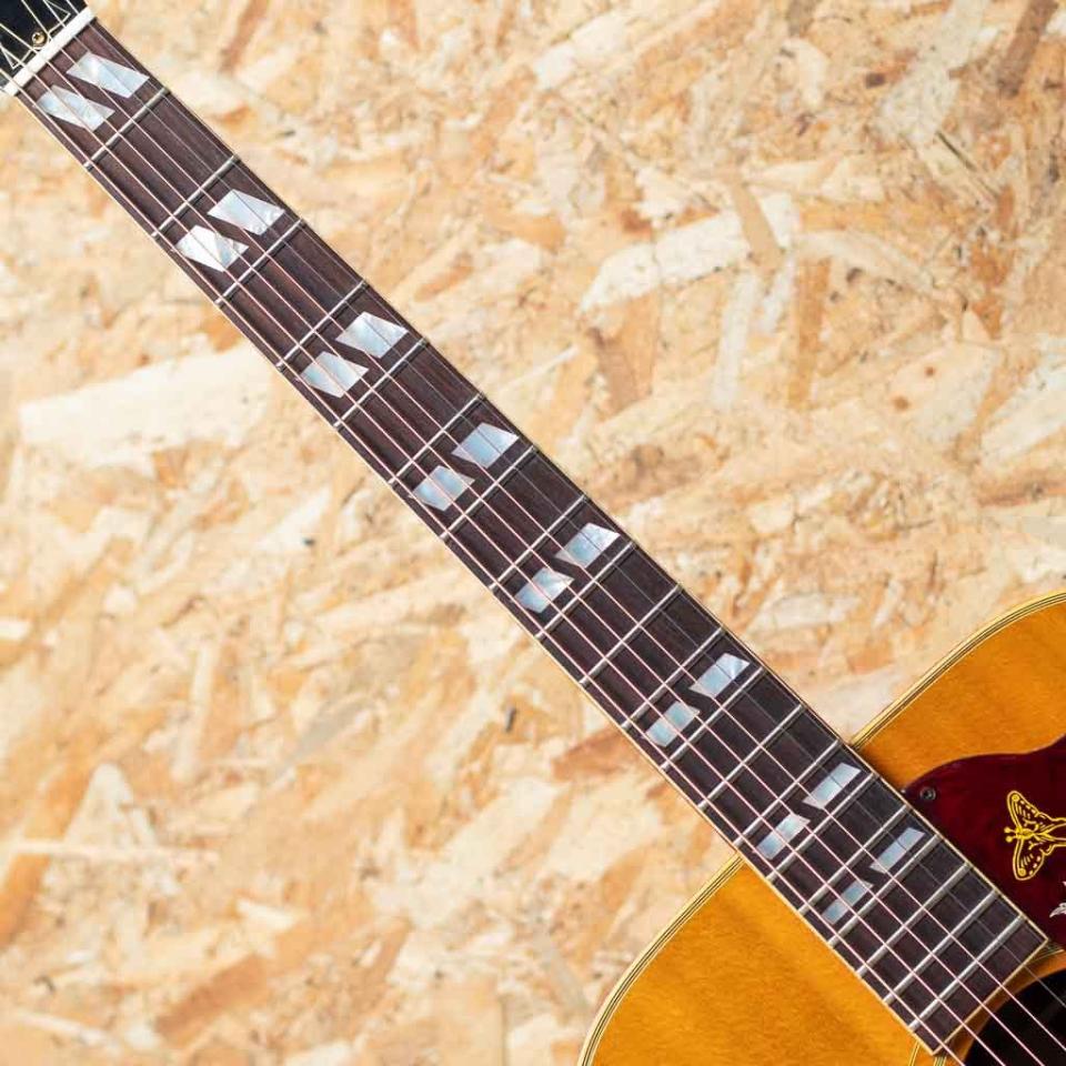 1960年の発売以来、ギブソンスクウェアショルダーボディの定番モデルとして人気を博しているハミングバード。ボディカラー、ピックガードの装飾など、個性溢れる外観とオールラウンドなサウンドキャラクターを兼ね備えています。本器は1968年製ナチュラルカラーの1本。スプルーストップ、マホガニーサイド&バック、マホガニーネック、14度ヘッド角、ナローネック仕様、ハカランダ指板&ブリッジ、ウッドアジャスタブルサドル、クラウンヘッドインレイ、ダブルパラレログラム指板インレイ、クルーソンゴールドペグ、ねじ止めのオリジナルピックガード、ノンスキャロップブレイシング、フルスケール仕様。フルスケールやアジャスタブルサドルによるパーカッシブで歯切れの良さ、まとまりのある響き方。ピッキングではガシャンドシャンとしたサウンドから甘く太いサウンドまで味わえます。比較的見られるバインディングの縮みや部分的なピックガードの反りはありますが、割れなどは見られずウェザーチェックも少なめで、年代程の使用感も感じられず大切に使用されていたことが伺えるきれいな状態です。ガシガシと弾き込んでいただくのももちろん、コレクタブル要素もある1本です。オリジナルハードケース付属です。