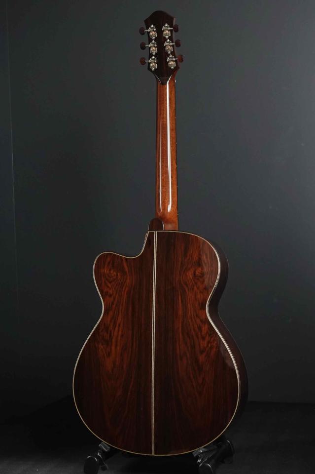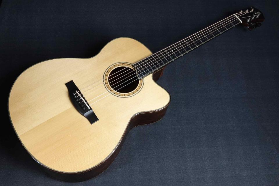 こちらは2017年に製作され大阪サウンドメッセで展示されたモデルで、14フレットジョイント仕様のOMタイプのボディサイズに色白のヨローピアントップ、ダークで美しいアマゾンローズウッドサイドバックの対比が美しい仕様となっており、前オーナーが大切に使用していたようで、年式の割にはかなり状態の良い美品中古品です!