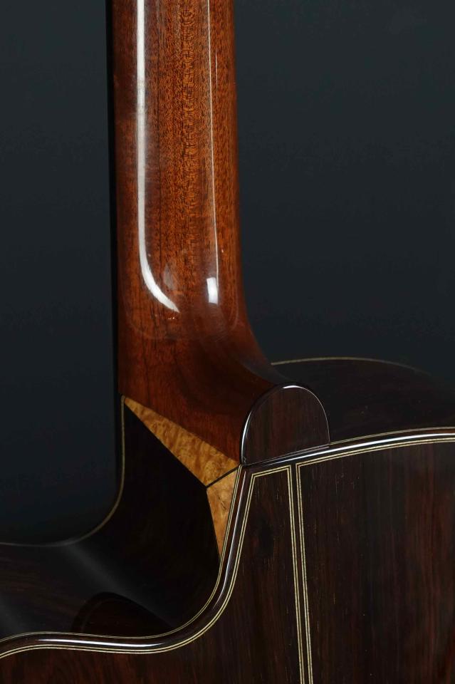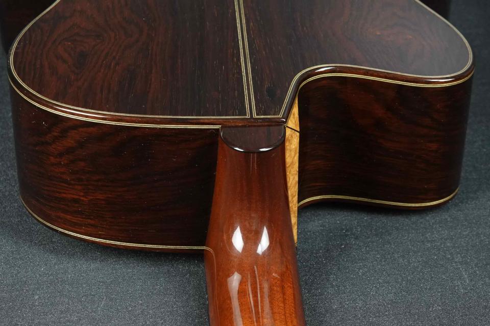 すっきり色白のトップ材に、バール杢の花梨を使った、龍の尾を思わせるオリジナルロゼッタ。メイプルのウッドパーフリングにインディアンローズウッドのボディバンディング仕様です。サイドバックは、ダークな色の濃いアマゾンローズウッドが使われています。サイドはダブルレイヤー構造です。