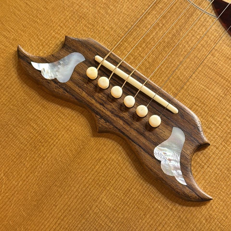 ローズウッド製の象徴的なダヴ・ブリッジには、マザー・オブ・パールによる2羽の鳩のインレイが施されています。