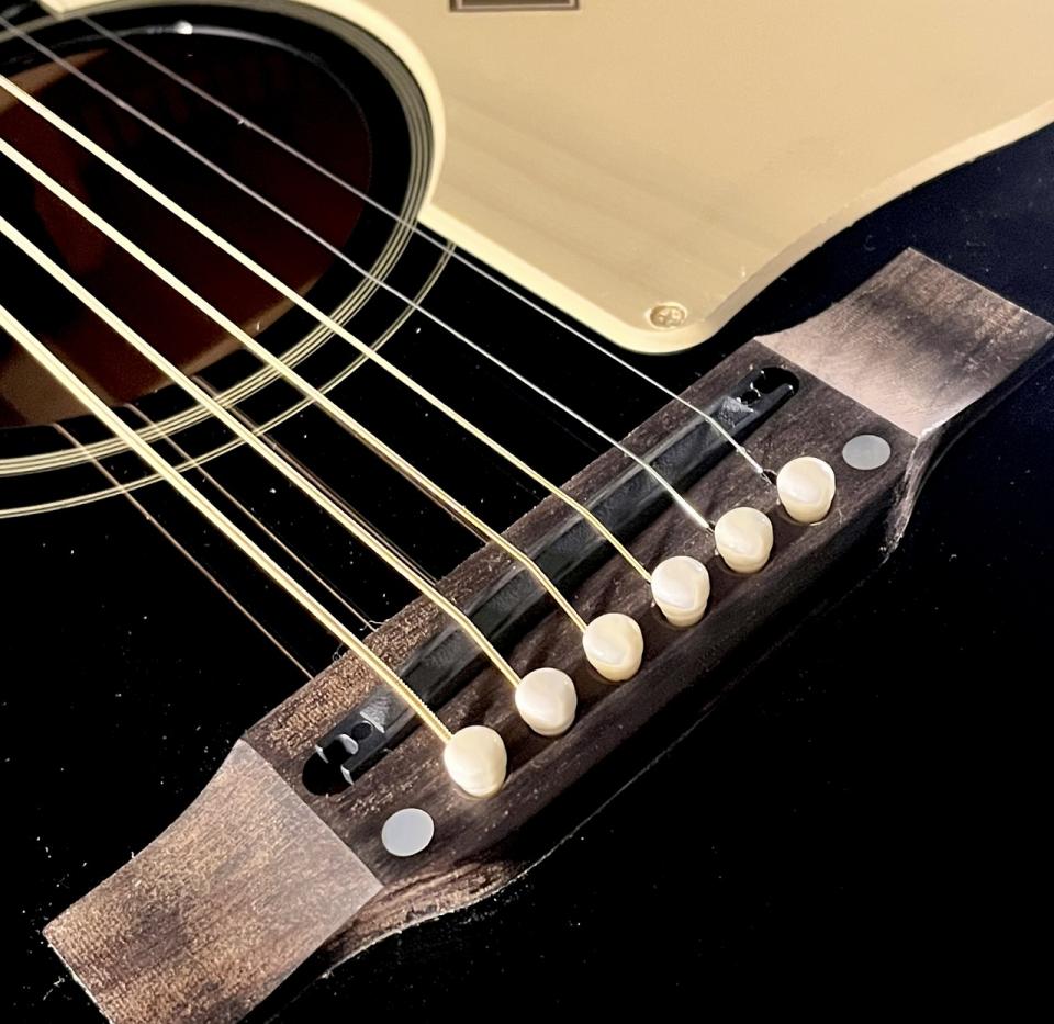斉藤氏のJ-45のトレードマークとなっている、光沢を帯びたグロス・フィニッシュのエボニー(黒)のボディをはじめ、サウンドホール・リング位置の再現、ギブソンと同じダミーネジまで再現した60年代スタイルのクリーム・ピックガードなど、斉藤氏の拘りが詰まったギブソンJ-45に限りなく近づけたルックスを実現しました。