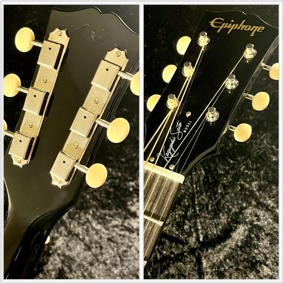 『Epiphone Inspired By Gibson Custom Kazuyoshi Saito J-45 2026』の特徴として、“オープンブック・ヘッドストック” と呼ばれるギブソンと同じヘッド形状があげられます。さらに、斉藤氏のサインがプリントされたトラスロッドカバーや、ギブソンと同様に3連タイプでクリーム色のオーヴァルノブ付きチューナーなど、一見すると斉藤氏愛用のギブソンJ-45と見分けがつかない程の再現性を持ちます。