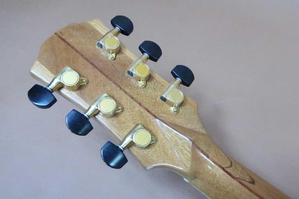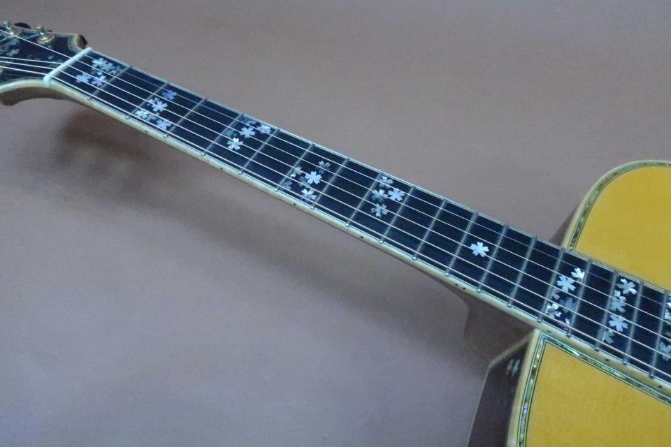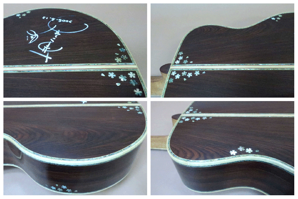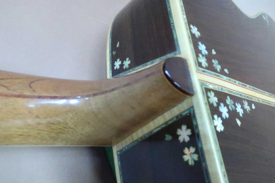 稀少なギター製作家 志賀鉄三氏、渾身の逸品!ヘッドの桜から舞い散る桜吹雪インレイ、サイド&バックにも桜吹雪を散りばめたワインポイント・インレイ、芸術性の高い装飾デザインは素晴らしいの一言です。