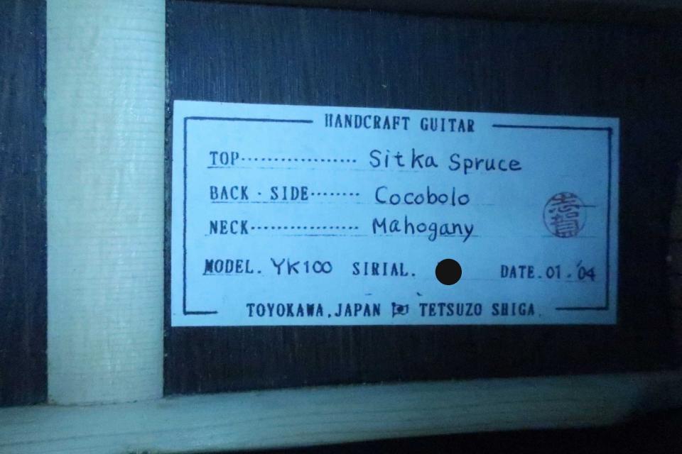 在庫一覧 Tetsuzo Shiga (志賀鉄三) YK-100 TM-Style Custom / Solid Sitka Spruce Top・Solid Cocobolo Side and Back・Ebony Fingerboard and Bridge・000-45 Style Abalone Trim and 桜吹雪 Fingerboard and Body Inlay・本鼈甲 Pick guard【With Boblen Hard Case】 2004年製
