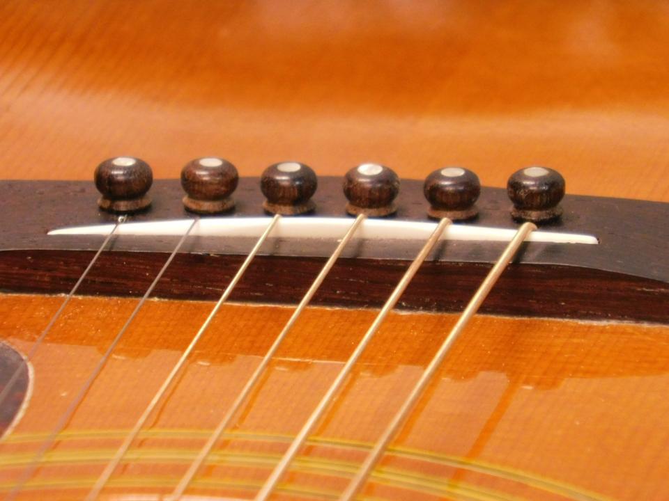 交換パーツはペグ(近年物クルーソン)、弦留めピン×6,ナット、サドル、ストラップピンが追加され移設跡があります。