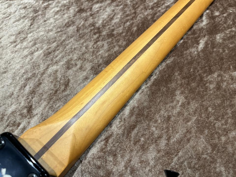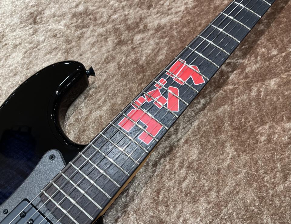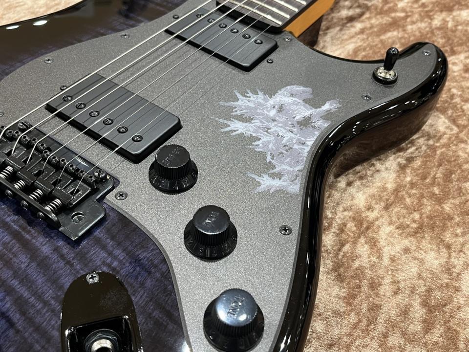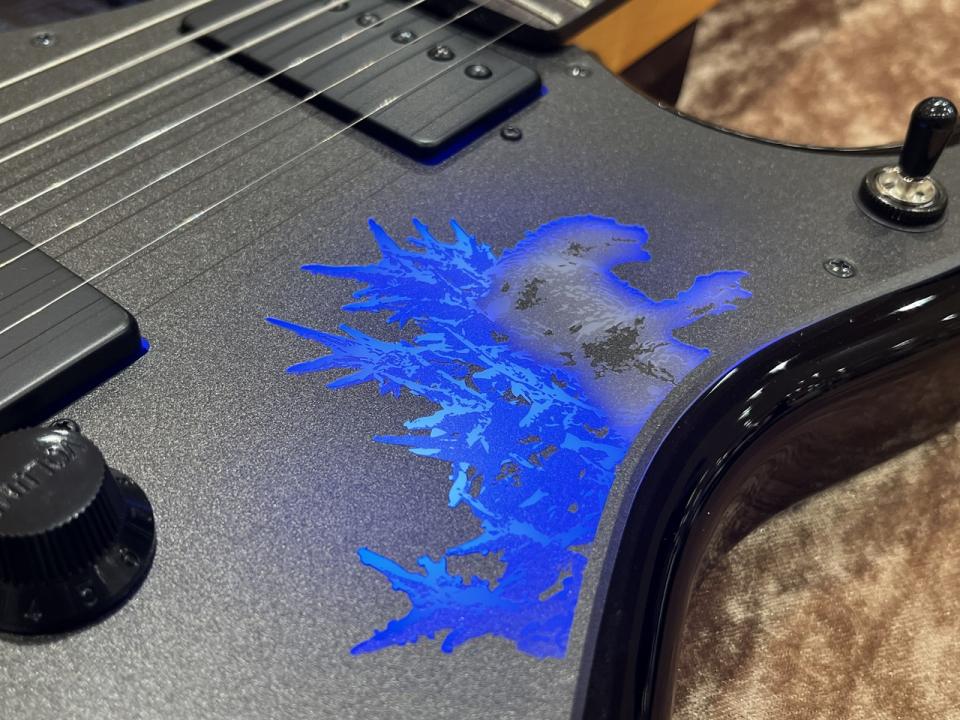 アルダーボディにマートルウッドを貼り合わせ、深みのあるブルーで染色しグロスフィニッシュで仕上げることで、ゴジラならではの重厚な存在感を表現。ネックは“Modern C”シェイプで、22フレット仕様のミディアムジャンボフレットを採用し、指板の12フレット付近には、ゴジラのロゴが大胆にあしらわれており、視覚的にも強いインパクトを与えます。