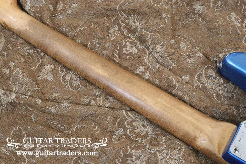 Naturally, the body has been refinished with nitrocellulose lacquer, and while the neck features some overspray of clear coat in places, the headstock decal is original, and the “2 AUG 62 B” stamp remains on the neck heel.
