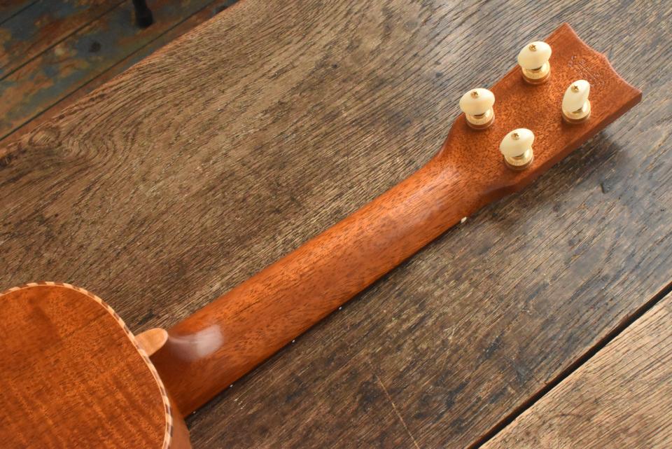メイプル×ハワイアンコアを用いたロープバインディング&ロゼッタ、斜めにカットされた指板エンド、クラウンの揃った可愛らしい絶妙なヘッドシェイプなど、オールドカマカの持つゆるい雰囲気を感じる外観が特徴です。