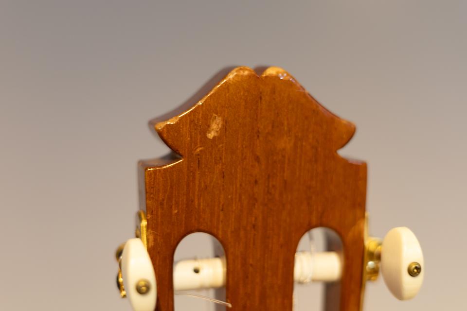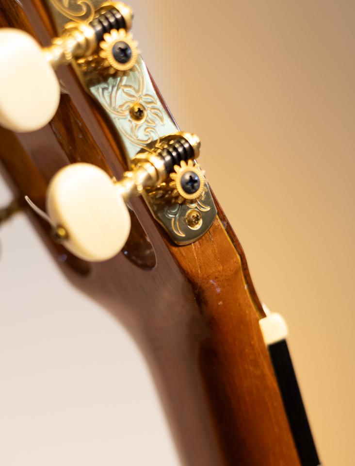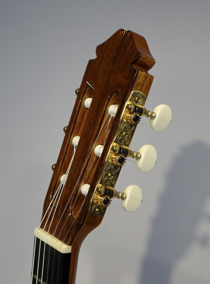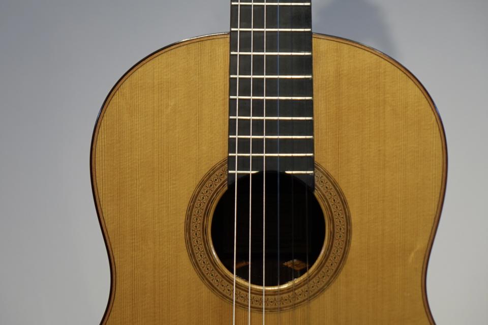 マルセリーノ・ロペス 1993年中古品を入荷しました。低音は粘りがあり、高音はふわっと上品に鳴ります。弦高も低いのでとても弾きやすいです。上質なハカランダ材を使っていて、ボディ内部のインレイも美しいです。糸巻の6弦付近にクラックがありましたが、修理済みです。ヘッド裏にも傷があります。