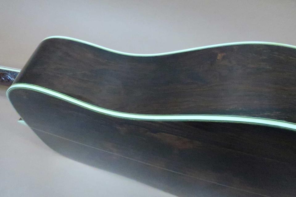 希少なHC(ハンド・クラフト)シリーズのハイエンド・モデル!本貝ツリー・オブ・ライフ・フィンガーボード・インレイ、トップがスプルース、サイド&バックがハカランダ、ヒール彫刻、アバロントリムの逸品。