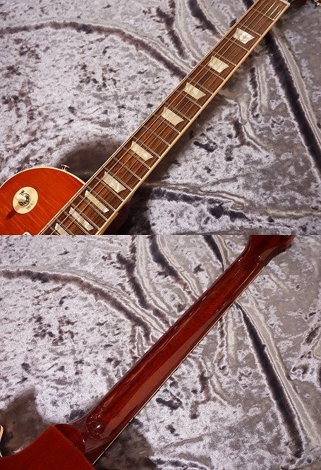 レスポールスタンダードですが、スリムなアシンメトリー(左右非対称)ネック、グローバー製ロックチューナーや、イモネジで固定が出来るトーンプロズ社製ブリッジ、テイルピースなど、現代的なスペックを多く取り入れたモデルです。Body Topの杢もバランス良くきれいに出ています。
