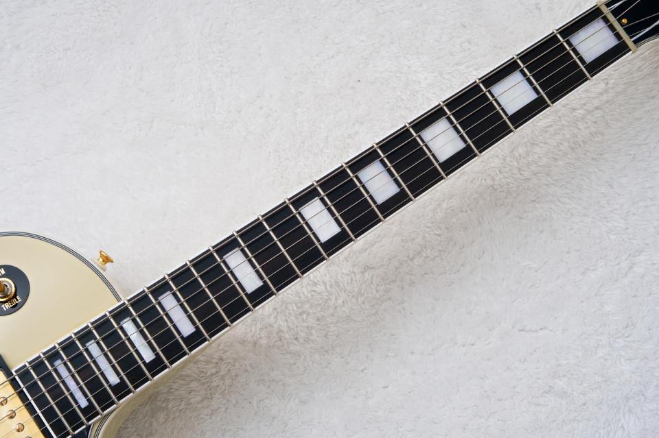通常指板はローズウッド指板となっておりますが、カスタムタイプの特徴であるエボニー指板を採用。