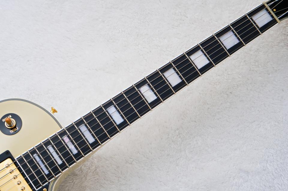 通常指板はローズウッド指板となっておりますが、カスタムタイプの特徴であるエボニー指板を採用。