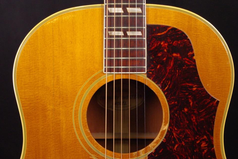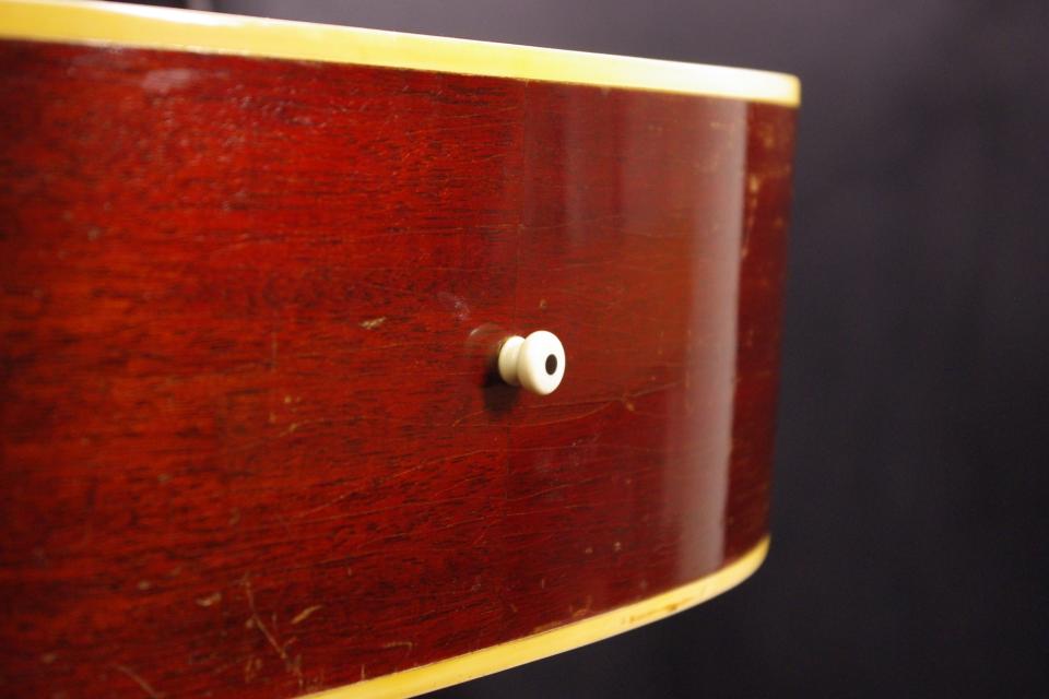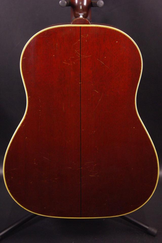 1950年代のラージピックガード期のカントリーウェスタンが入荷しました!!サザンジャンボのナチュラルカラーとして生産されたラウンドショルダー上位機種!トップはスプルース、サイドバックにはマホガニー、指板とブリッジにはハカランダを採用、ヘッド、指板にはインレイが入っておりルックスも存在感があります!シリアルナンバーから1957年に生産されたモデルでペグはクルーソン製に交換しています。オリジナルと同じ形状のため違和感がございません。薄いラージピックガード、ブリッジはオリジナルで残っていました。ネックヒールへはストラップピンが打っています。ピックアップの取り付け加工はございません。エンドピンは交換です。トップのピックガード内側にクラック補修、ブリッジ下に2本クラック補修があります。サウンドホールに弾き傷、年代相応の傷、ウェザーチェックが入っていますが雰囲気が素晴らしく演奏性、サウンドも優れていますので狙い目です。ナット幅は約43mm、60年代と比べるとやや厚みがありしっかりとしています。ネックは以前にリセット調整済みでアングルも理想的です。トラスロッドの動作も問題なく機能しています。フレットの減りは少々ありますが今後もまだまだお使いいただけるほど高さに余裕があります。弦高は12フレット6弦側で約2.6mm、1弦側で約1.8mmの高さで調整していますがお好みに合せた微調整にもお応えいたします。J-45、J-50と比べると高音の抜けがよく煌びやかで美しく響きます!低音も太くパワフル!ビンテージの乾いた味わい深いサウンドが魅力ですね!!是非この機会にお試しください!ハードケース付。