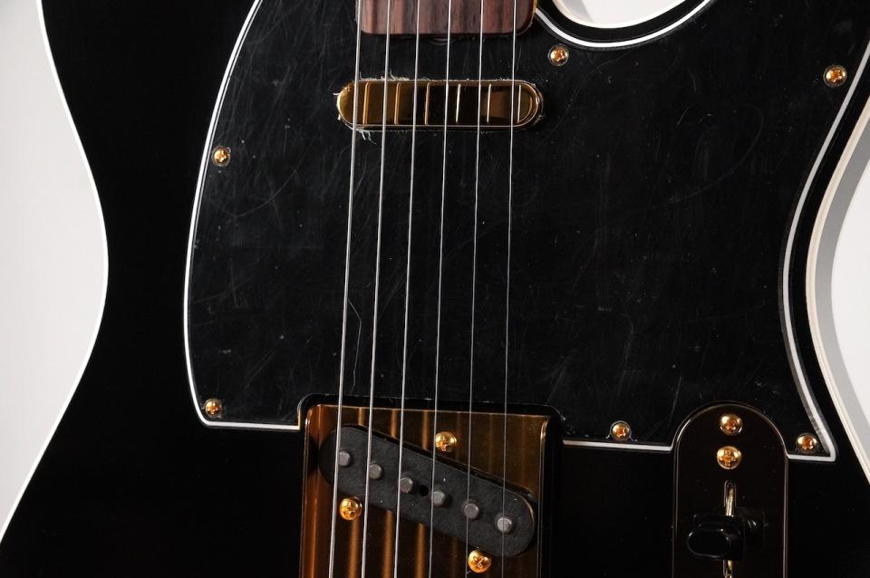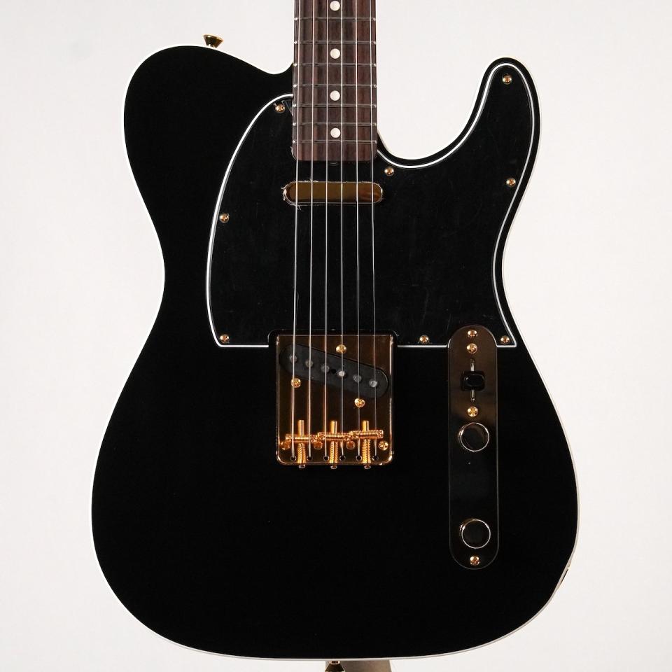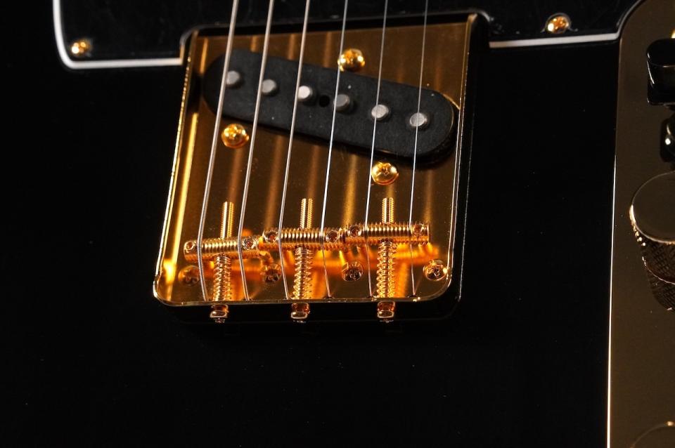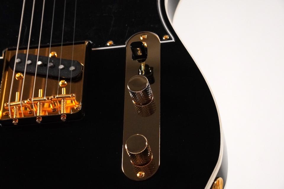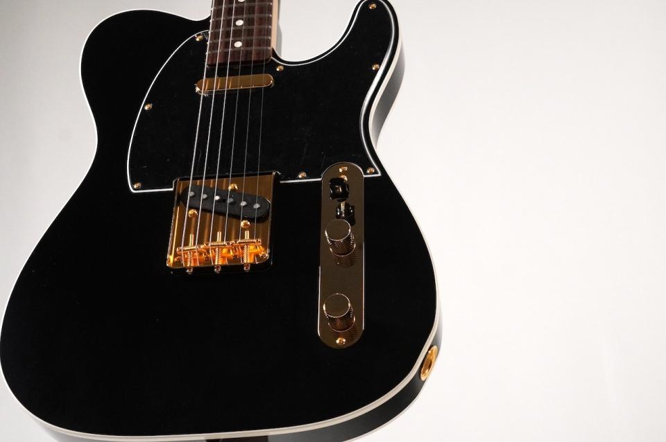 ブラックのボディにブラック3Pピックガード、さらにゴールドパーツを組み合わせたシックで高級感のあるルックスに仕上がっています。