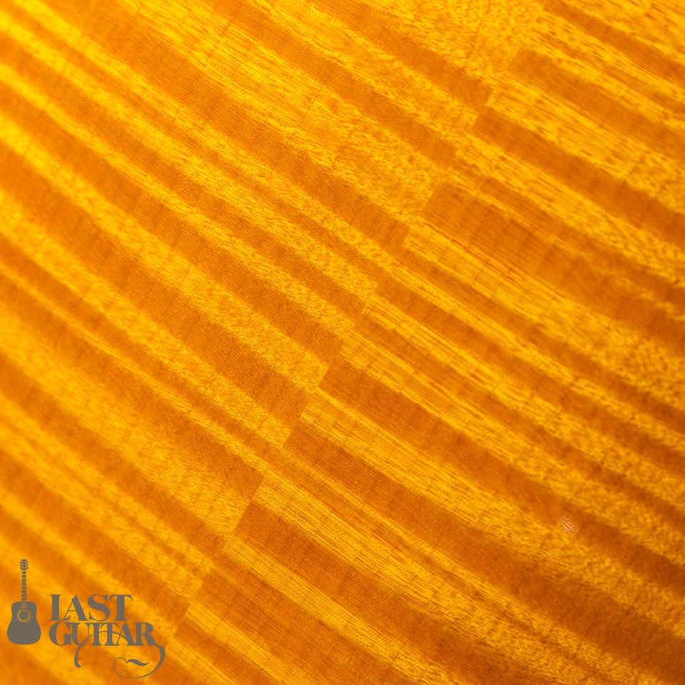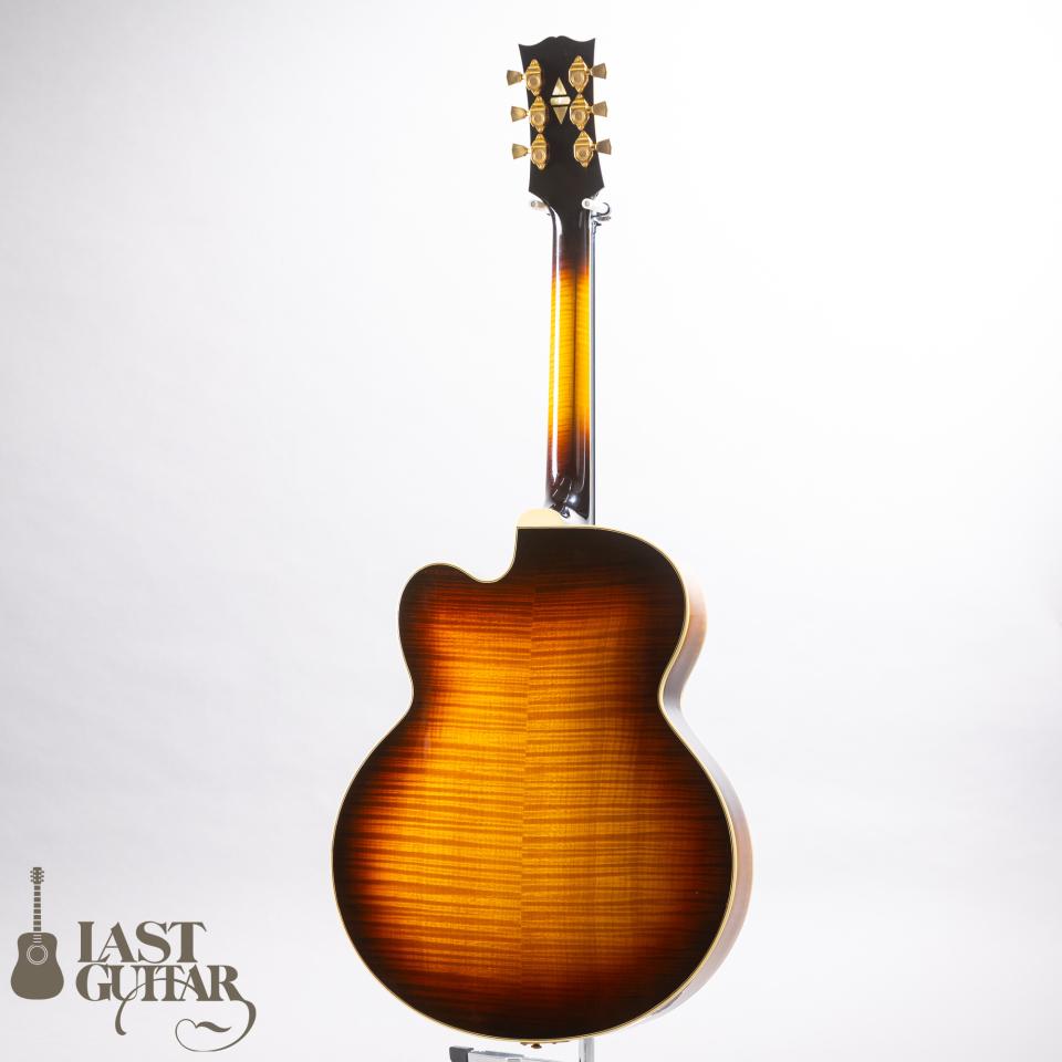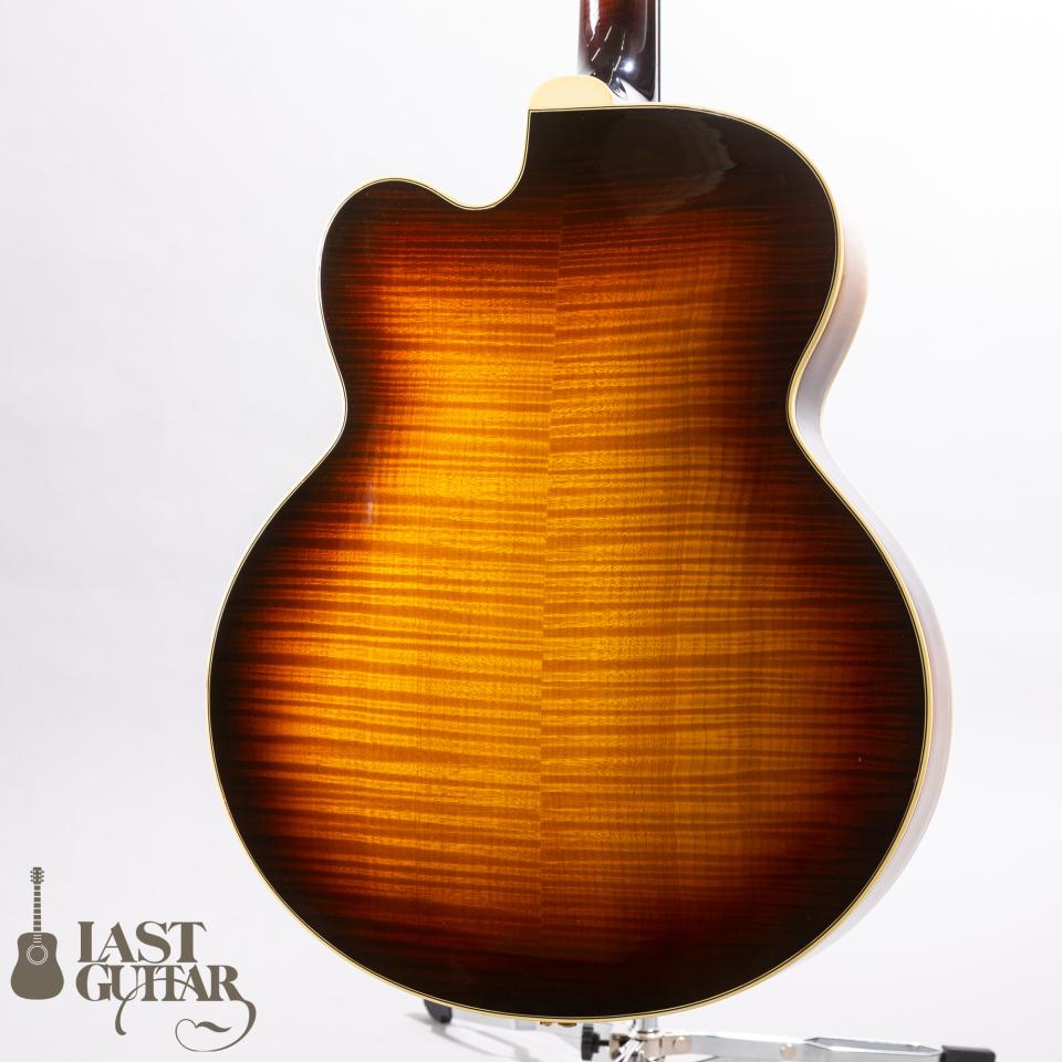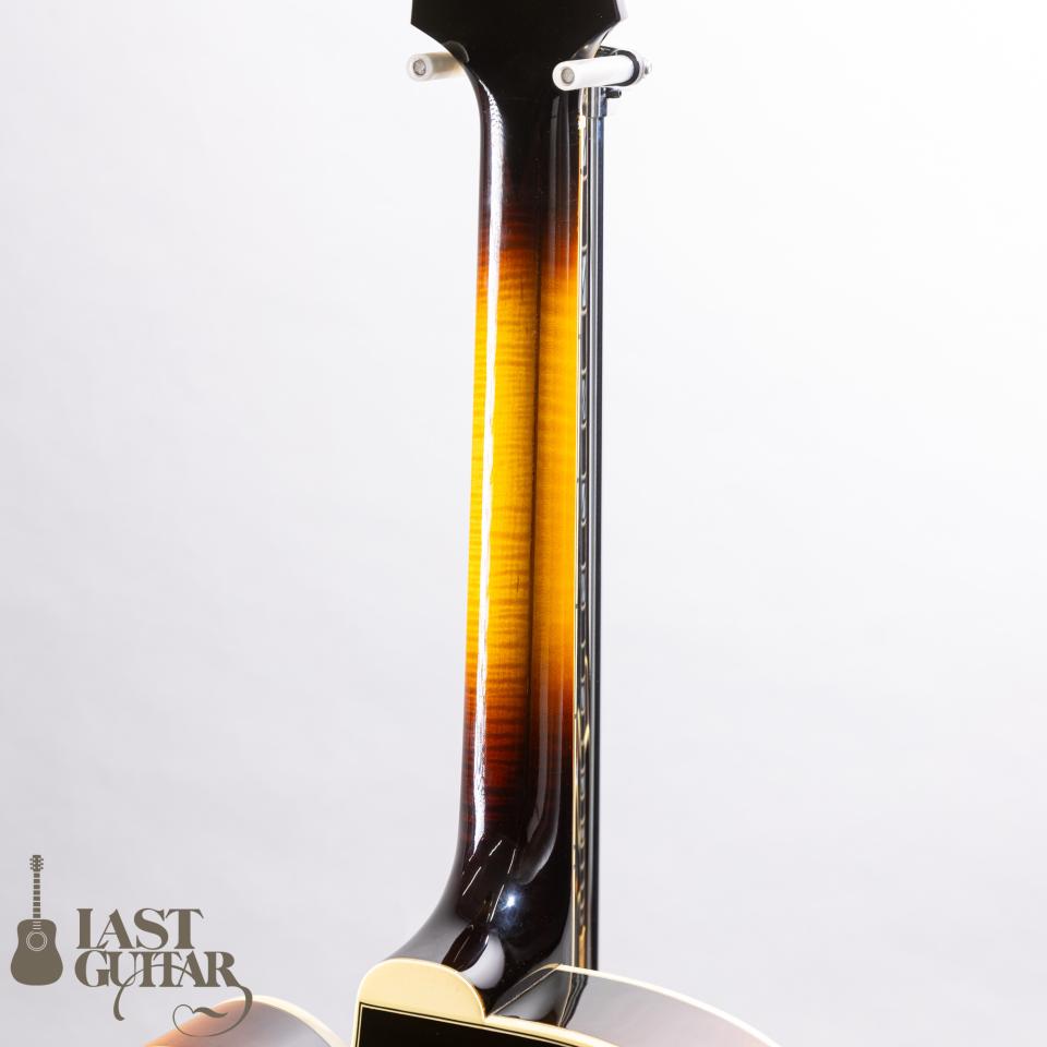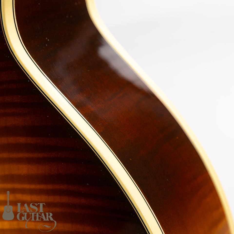 とても美しいアーチを持つトップには、目の詰まった上質なスプルース、サイド&バックには、とてもきれいな極上のフィギュアドフレイムメイプル、そしてネックにも美しいフィギュアドフレイムメイプルが使用されております。フィンガーボードは、高級材エボニーで、最高峰に相応しい豪華なウッドマテリアルとなっております。ネックまわりは、ナット幅は約44ミリで、程よい厚みを持ったグリップ感で比較的どなたにも馴染みやすいと思います。ピックアップは、王道の’57 Classicを2基搭載しており、ロングスケール、貫禄たっぷりのボディとの組み合わせから生まれる豊かなトーンは素晴らしいです。
