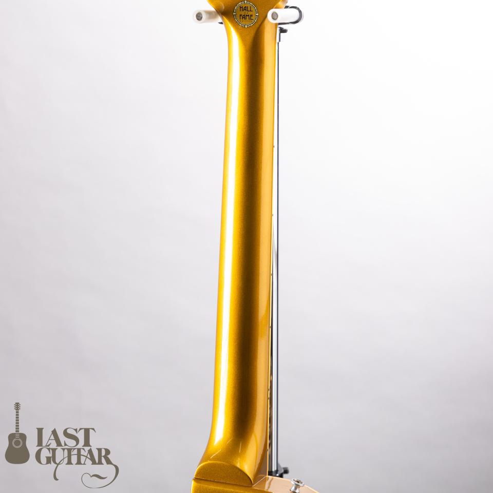 1991年に限定生産された”Hall of Fame”オールゴールド仕様のレス・ポール・デラックスです。通常のナチュラルブラウンバックとはまた違った豪華な佇まいで、とてもカッコいいです。フィンガーボードのディッシュインレイやバインディングなども経年により色づいて渋いゴールドカラーとよくマッチしています。またヘッド裏側に、Hall of Fame Editionのデカールが貼られているのも特別感があっていいですね。