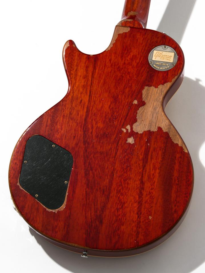 本機は長年使用されていたかのようなHeavy Agedが施された個体です。チューブレストラスロッドやニカワによる接着など製作方法の見直しなど様々な面を一新したことで、サウンド面でも抜群に評判の良い2014年製の個体で、ボディトップにFigured Maple,ボディバックとネックにはMahogany、12inchラディアスのRosewood指板を採用しています。マホガニーの着色にはVintageのような風合いをもたらすAniline Dye塗装を採用しています。