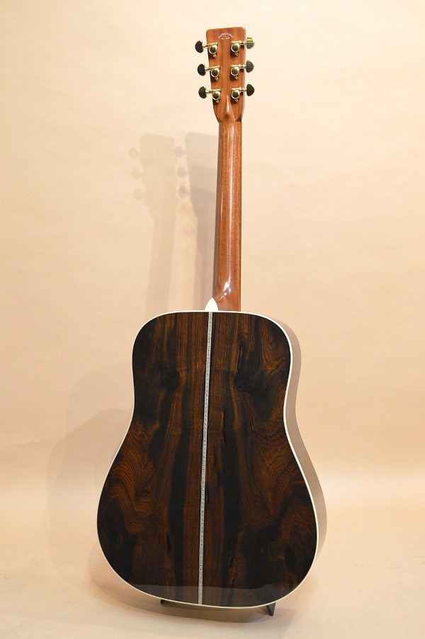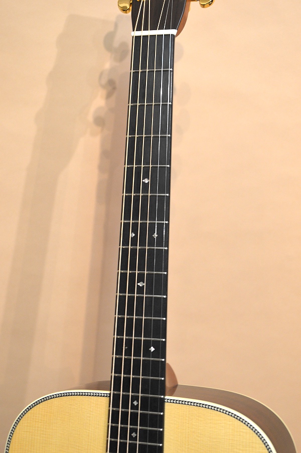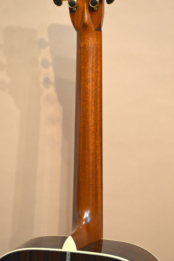 セレクト・アディロンダック・スプルースTOP、セレクト・ブラジリアン・ローズウッド(ハカランダ)SIDE&BACK、セレクト・キューバン・マホガニーNECK、エボニー指板&ブリッジ、ロング・スロット・サドル、’34スタイル・セミ・フォワード・シフト・スキャロップ・ブレーシング、実測44.5mmナット、645mmスケールのヘリンボーン・ドレッドノート・ボディー。カスタム・オーダーされた方はとにかく百瀬愛が強く(笑)、「今の技術や解釈で、百瀬さんが思う究極のHD-115を作りましょう」という事で誕生した究極のHD-115になります。使用材はもちろんの事、細かい箇所にもカスタム・オーダーならではのこだわりが満載です。ブレーシングは百瀬さんお得意の’34ブレーシングながら、より爆発力と直進性に優れたサウンドを狙って少し浅めのシャロウ・スキャロップになっています。SIDE&BACKのハカランダはどちらかと言えば板目ですが、当時ヘッドウェイでストックしていたハカランダ材全ての中から選んだ最上級の物が使用されていますし、ネック材にはキューバン・マホガニーを使用するなど、こだわりまくった至高の1本になります!因みにペグはグローバーに見えると思いますが、更に精度の高いシャーラーのM6ビンテージGOLDが使われている辺りにもこだわりが感じられます。また、シリアル・ナンバーは「777777」。通常の通しシリアルでは間違いなく到達できない数字ですが、「究極にして百瀬さん最終形のHD-115」という意味も込めて特別にオール・ラッキー7のシリアルにしてもらいました(笑)。