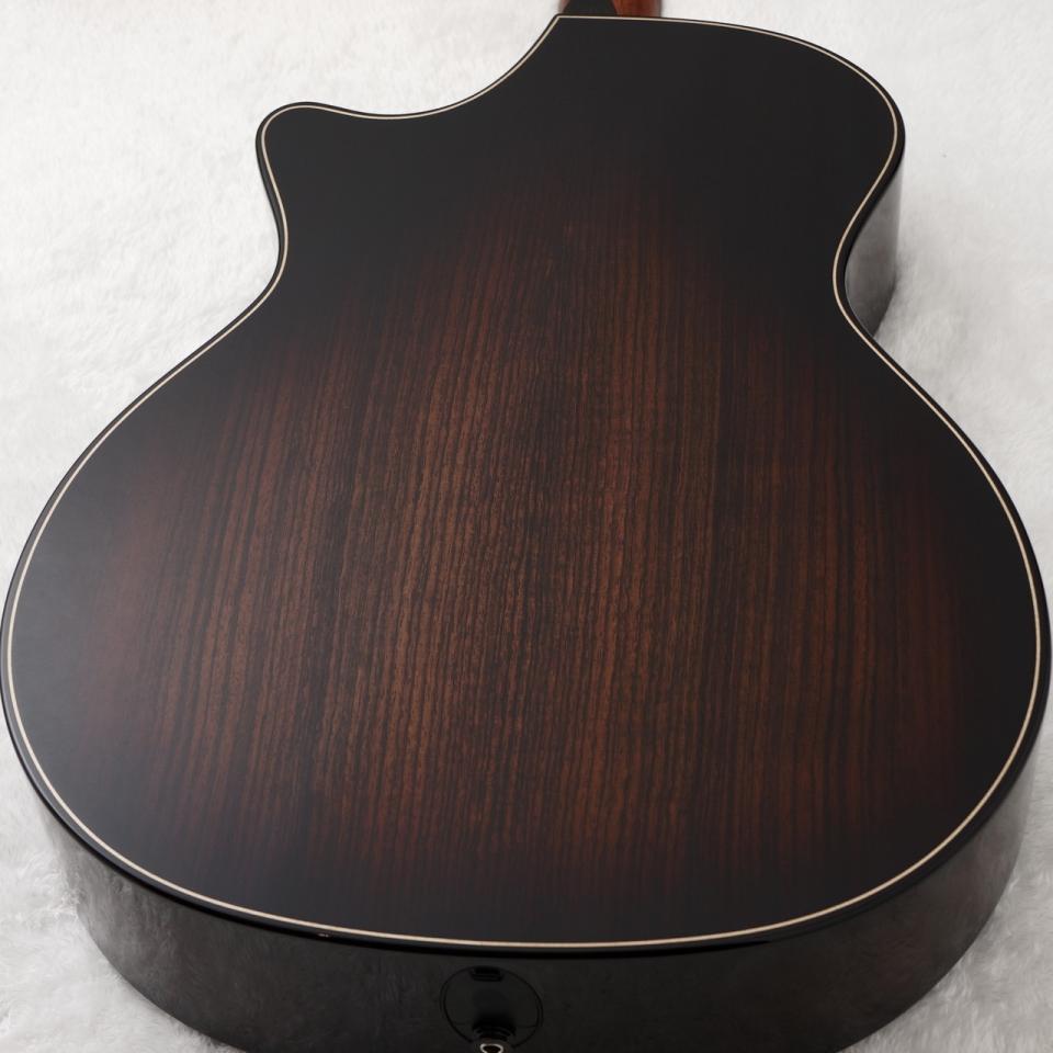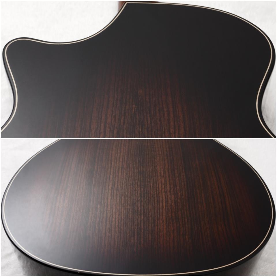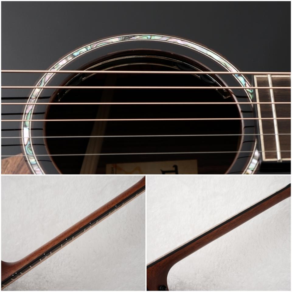アームレストを始めとするボディ全体の面取りに加え、ベベルトカッタウェイと呼ばれるこれまた面取り加工が施されたカッタウェイにより、抱えた時のフィット感が大変優れており、テイラーらしい高い演奏性が極まっています。