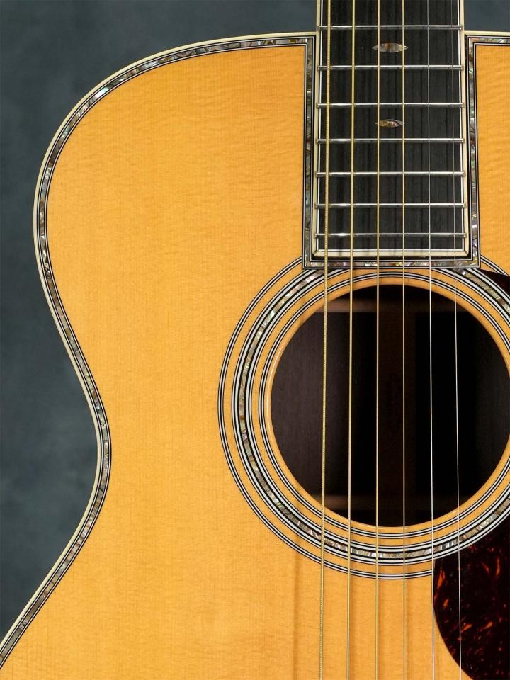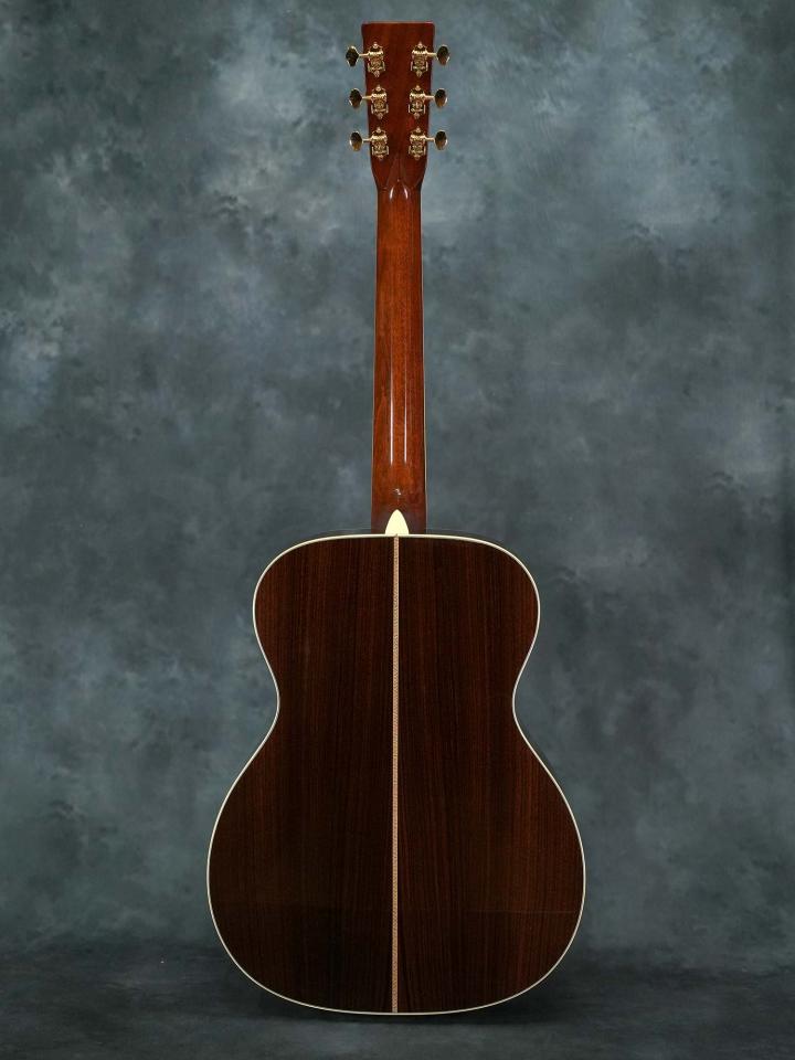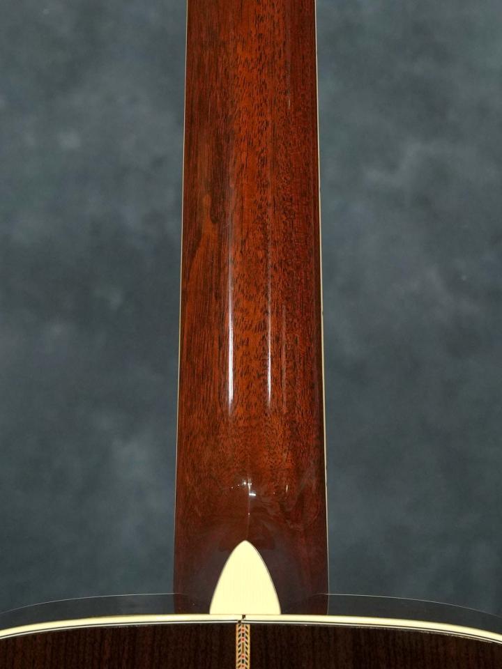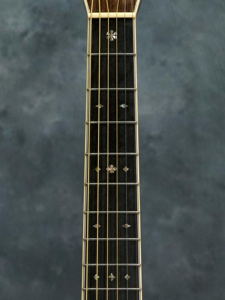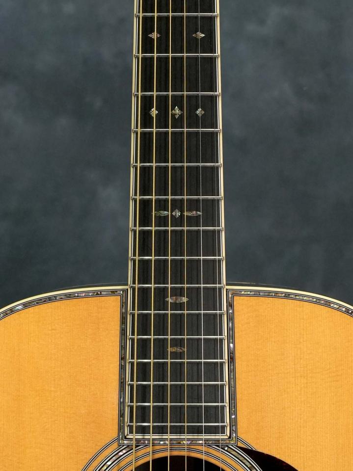 シトカスプルースTop&インディアンローズウッドSide/Backのオーディトリアムボディにスキャロップブレイシング、ナット幅45.2mm(実測値)でソフトなVシェイプのセレクトハードウッドネック、約632mmのスケール、エボニー指板、エボニーブリッジ、オープンバック/バタービーンノブのゴールドチューナー。2018年には「000-42 Standard」としてモデルチェンジしバインディングの素材やネックシェイプなどが変更されますが、本器はモデルチェンジ前の旧タイプとなります。