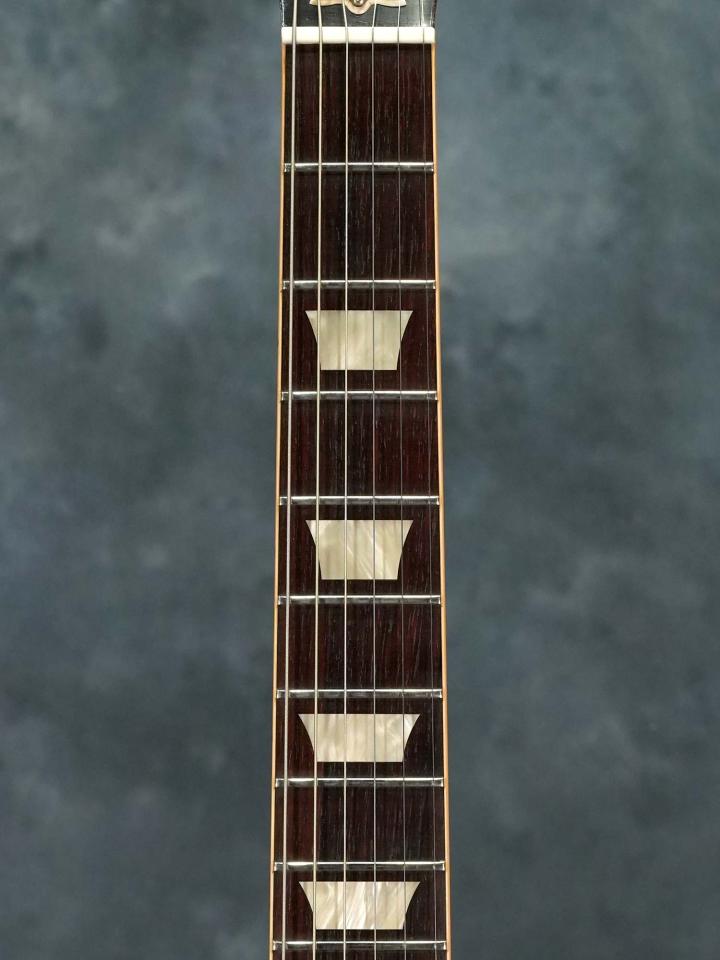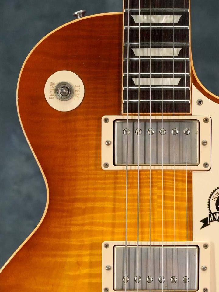 雰囲気の良い揺らいだフィギュアドトップと50th Anniversary専用ピックガードによる特別な雰囲気、エイジドモデルとは言え使用感も少なく外観&演奏性共にコンディションは良く、しっかり使える格好良いレスポールをお探しの方にオススメの一本です。