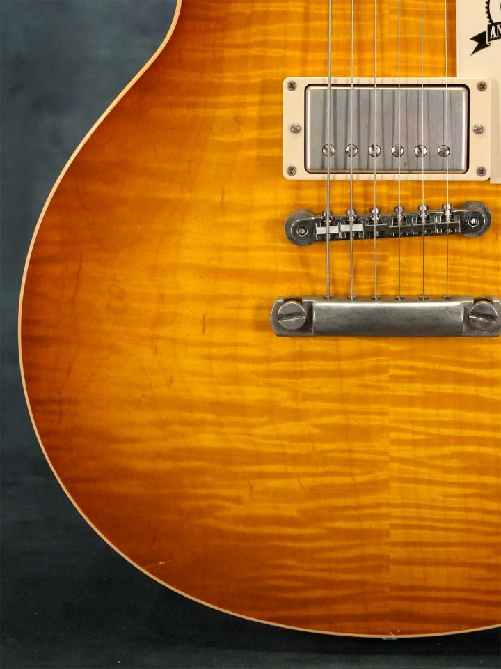 角度によって表情を変える細身で揺らいだフィギュアドメイプルTopにマホガニーBackのボディ、マホガニーネック、ローズウッド指板、年を追うごとによりオリジナルへ近づくヒストリックコレクションの中で、大まかに2003年~2008年までの仕様となっており現行モデルに採用されるようなよりヴィンテージに近い仕様とは異なるものの、フレックの出たメイプルとエイジド加工によって雰囲気良く仕上がっています。