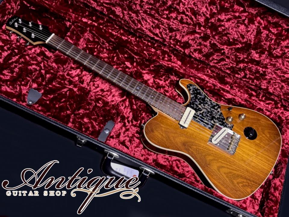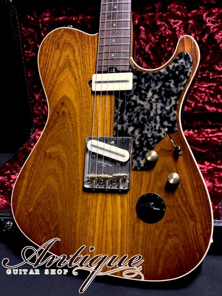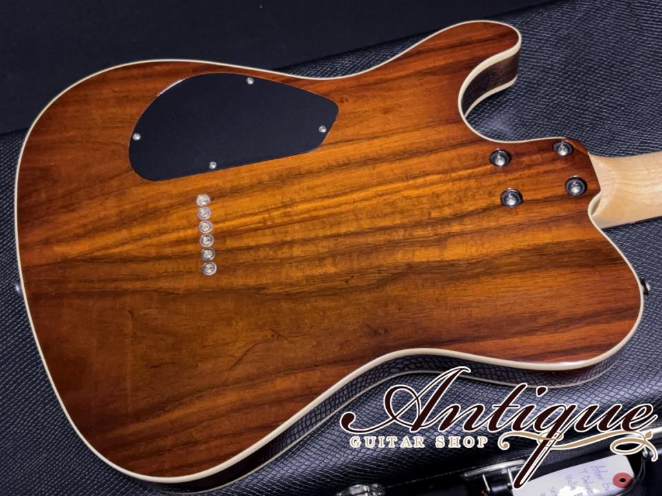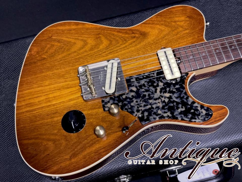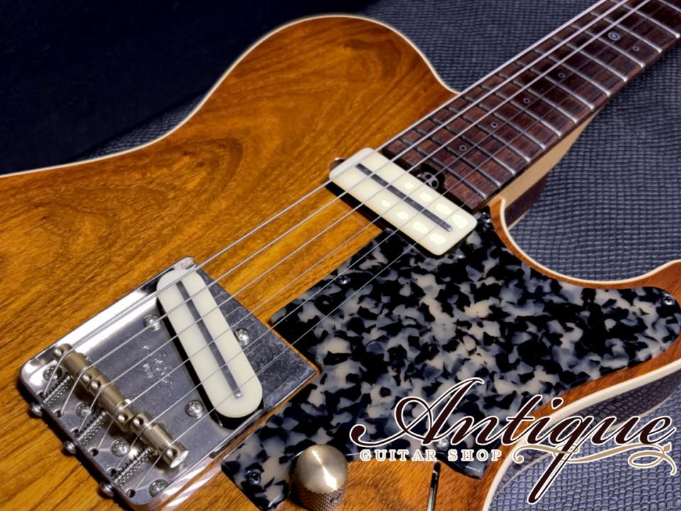 まずそのスペックとしては、テレキャスターモデルをベースとしながらオフセットのオリジナルシェイプ、ボディトップ&バックにはマッチドのローステッドスワンプアッシュ、ボディコア材にはローステッドパウロニア(桐材)を採用し、共に特に厳選された材を採用しローステッド加工を施す事で、総重量は約2.83kgとホロウ構造やチャンバード構造でもなくソリッドボディながら超軽量な個体に仕上げられております。フィニッシュカラーはオーセンティックな渋い風合いを持ったバイオリンバースト、ボディトップ&バック共にバインディングが施された高級感のある仕様となっております。続いてネックですが、こちらはまっすぐなクォーターソーン(柾目取り)のロックメイプルが採用されておりますが、ハッキリとした強い杢目に加え角度によって浮かぶフィギュアドライクなギラつき、硬質材の証でもあるフレックラインも確認出来るサウンド重視の最高峰の材が採用されております。また指板に採用されたローズウッドもダークなコントラストかつ強い黒の杢目がうねるハカランダさながらの極上材となっており、スペックシートが無ければ間違えてしまうレベルです。その他としては、オリジナルシェイプのヘッドはエボニー突板にアバロンのブランドロゴ、ブラックの鼈甲ガード、Asherオリジナルの”Single” Cutブリッジ、ヴィンテージスタイルのゴールドノブ、Prestige3×3のオープンギアチューナー、細部スペックとしては、1 21/32”(≒42mm)ナット幅、ネックシェイプは.82”-.89”の太すぎず細すぎないCシェイプ、指板ラディアスは12”R、ジェスカー47104フレットのツバ出し22F仕様等が挙げられます。