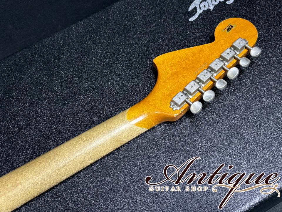 最後に状態としては、元々がハードなエイジド加工が施されている為、正確なコンディション判断が難しくなりますが、おそらく後付けだと思われるダメージ等については、ピックガード上に薄いスクラッチ、ボディバックのバックルスクラッチ、使用による若干の塗装変化が見受けられますが、エイジドモデルという事もあり違和感はございません。演奏面としてはネックコンディションは良好でトラスロッドの余裕もシッカリと残っており、フレットも僅かな部分減りがありながら8~9部山となっております。付属品としては冊子の認定書、オーダースペックシート、専用工具等の一式、ケースも本モデル様に型抜きがされたオリジナルハードケースが付属致します。
