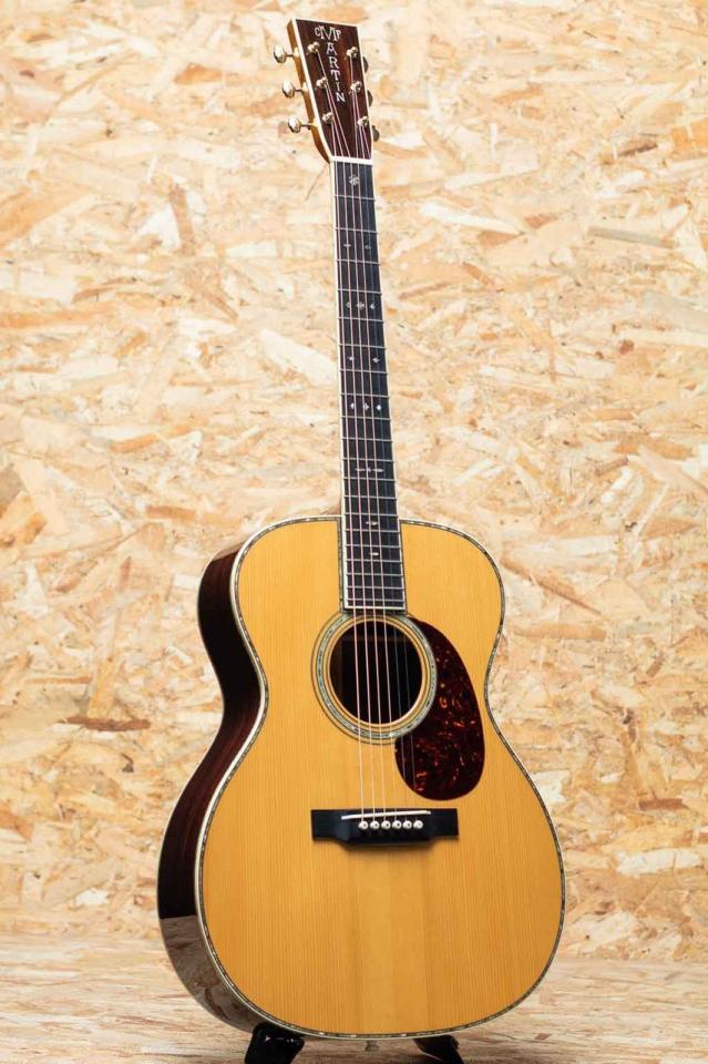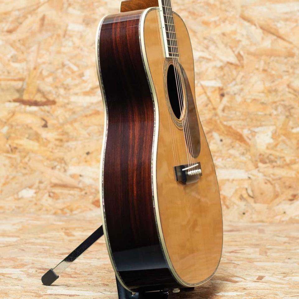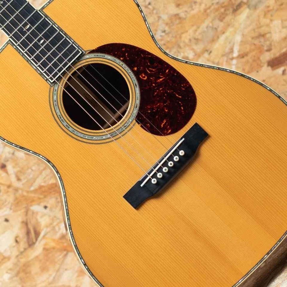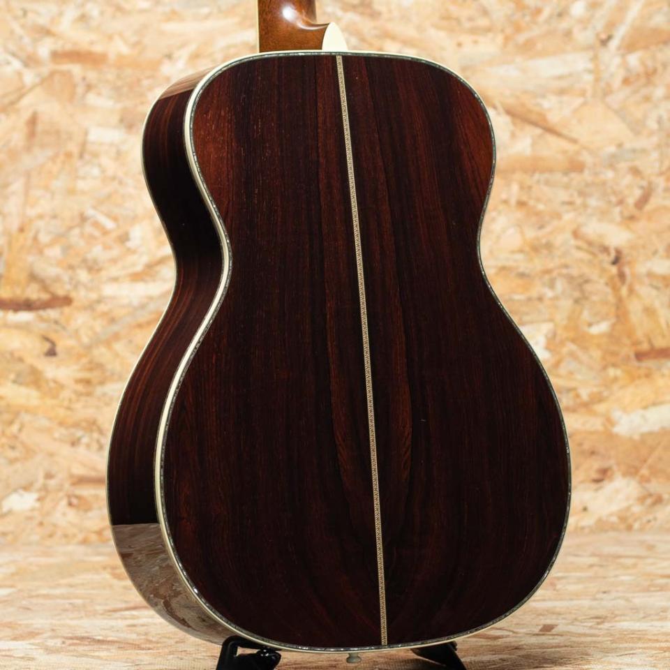 現マーチン工場の中でも、卓越した技術と豊富な経験から至極のギターを造り出す"Martin Custom Shop"。レギュラーラインとは全く異なった環境、工程にて製作。工場の一角に専用の区画があり、昔ながらの工法を継承しながらより精度の高い製作を行っています。ラインナップ上最高峰と言えるオーセンティックシリーズの製作をはじめ、高い完成度を誇るカスタムモデルを製造するトップクラスの部門です。本器はカスタムショップ製”CTM OOO-45 Adirondack Spruce Cocobolo”。2018年製のUSED品です。アディロンダックスプルーストップ、ココボロサイド&バック、44.5mmナット幅、ロープロファイルネックシェイプ、ブラックエボニー指板&ブリッジ、ロングサドル、Style45スノウフレイク指板ポジション、アバロンロゼッタ、Schaller GrandTuneゴールドペグ、ベッコウ柄ピックガード、オールドスタイルヘッドロゴ、2wayアジャスタブルロッド、アディロンダックスプルース材によるGolden EraスキャロップドXブレイシング。アディロンダックスプルース×ココボロの組み合わせによってパンチのあるトーンに幅広いレンジ、深い奥行きのある濃密なサウンド。45ならではのきらびやかな倍音感も十二分にお楽しみいただけます。バック・ストリップ脇にクラックがございますが、目を凝らさなければわからないほどきれいに補修がされています。その他、薄いスクラッチ傷やわずかな使用感はございますが、ネックのコンディションは非常に良好。現行Martinの最高峰チームが作り上げる、至極のサウンドを体感できる1本。是非お試し下さいませ。オリジナルハードケースが付属します。