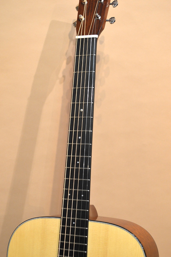 セレクト・アディロンダック・スプルースTOP、セレクト・ホンジュラス・マホガニーSIDE&BACK、セレクト・ホンジュラス・マホガニーNECK、エボニー指板&ブリッジ、ロング・スロット・サドル、’34スタイル・セミ・フォワード・シフト・スキャロップ・ブレーシング、百瀬最終形エボニー・ロッド、実測44mmナット、645mmスケールのドレッドノート・ボディー。2014年から始まった百瀬さんのエボニー・ロッドは補強無しからカーボン補強入り、T型に組んだエボニー・ロッド等々色んな事を試してきましたが、こちらのモデルのエボニー・ロッドが百瀬さんが導き出した、サウンドと強度どちらも兼ね備えた最終形です。硬いエボニーを通常のエボニー・ロッドより僅かに太くし、それをしならせたモノがロッドとして入れられています。これにより、カーボン補強入りよりも更に強度の高いネックが完成しました。そしてもう1つ特徴的なのが44mmワイドのネック・グリップ。43mmだと少し細く感じ、44.5mmだと気持ち幅広に感じるというお客様の要望に真摯に応えた44mmネック。シェイプは百瀬さんのいつものソフトVシェイプなので、鈍感な私にはあまり違いが判りませんが、、(笑)。案外44.5mmよりも気持ち細いネックをお探しの方は多いのかも、、。