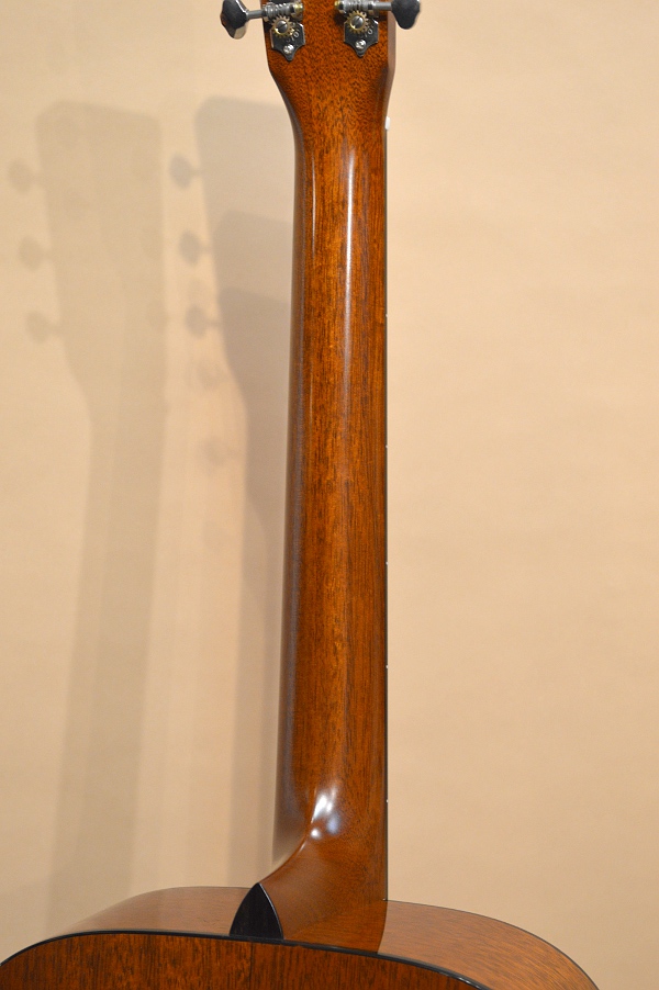 サウンドは百瀬作ならではのパワフルでトルクの強いサウンド!SIDE&BACKはホンジュラス・マホガニーなんですが、マホの甘さより百瀬サウンドの爆発力の方が勝っていて(笑)、コリングスも顔負けの超パワフルで直進性に富んだサウンドになっています。エボニー・ロッドの特徴としては、金属ロッドのような金属質な倍音では無く、ピュアでクリアーな倍音が特徴かと思いますが、、マーチンのようなフワンとしなるサウンドを期待すると裏切られます(笑)。やはりネックの強度が上がると、あのふにゃっとした柔らかさは無くなり、剛性の高いサウンドになるようです。こちらの個体もレスポンスが良くクリアーでテンション感のあるサウンドになっていますので、音だけ聴いてこれがエボニー・ロッドとすぐに分かる人も居ないんじゃないかと思います。金属ロッドの物としばらく弾き比べしているうちに、中域の甘さみたいなものが少し違うかな~?くらいの感じです。フラットピックで掻き鳴らせば、バリッとエッジの立った豪快サウンドの中にもマホらしい軽やかさも感じられる爆音を響かせますし、フィンガーで爪弾けば透明感のある美しい音色にスキャロップ・ブレーシングに因る伸びのあるサスティーンが加わり、美しくも切れの良い癒しのサウンドを奏でますので、あらゆるジャンルやプレイスタイルで、ワンランクもツーランクも上の極上のマホガニー・サウンドをご堪能頂ける事と思います!