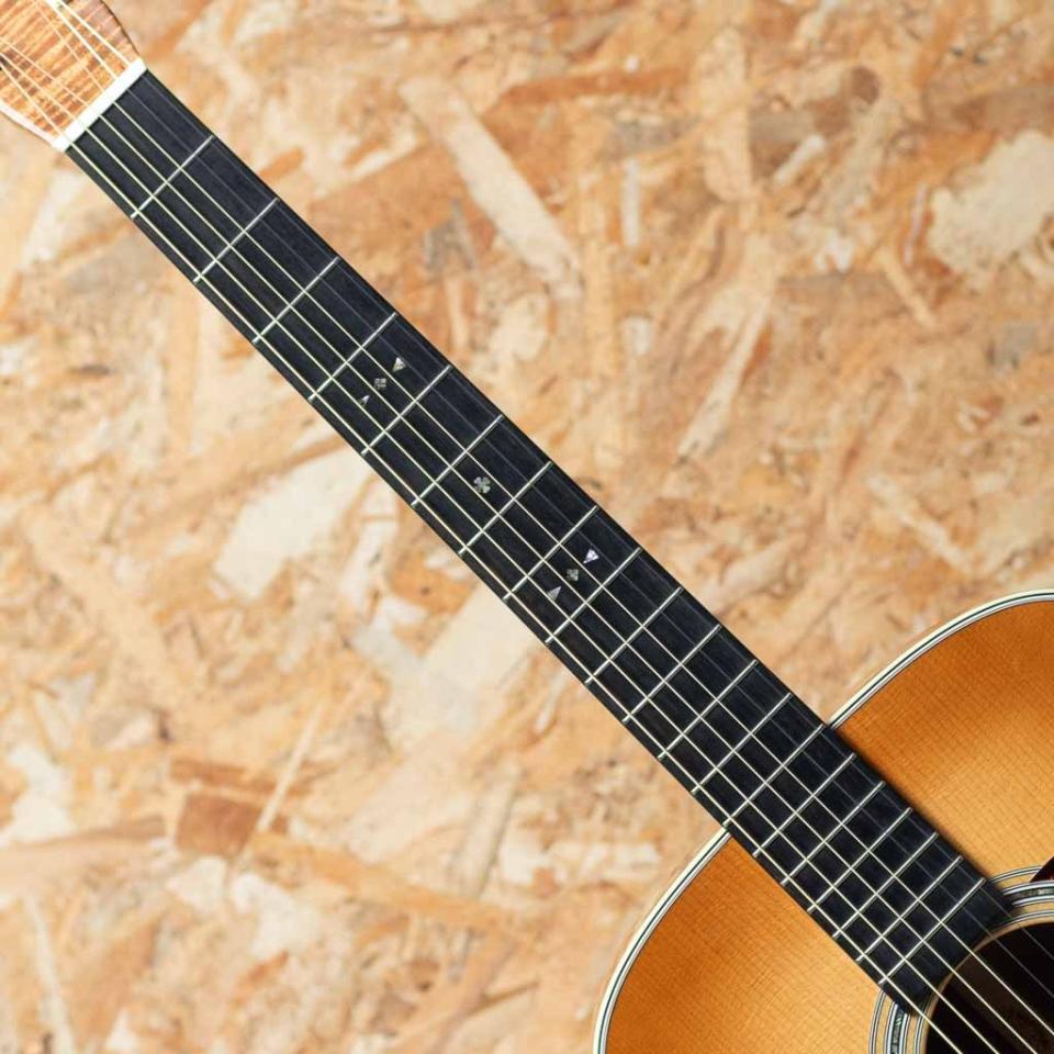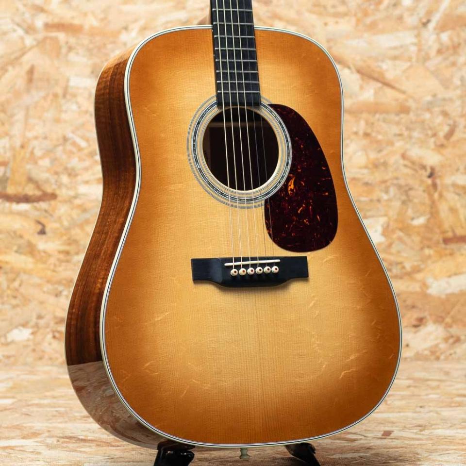 世界に一つだけのカスタムモデル!マーチンカスタムショップ製ギターとはマーティンファクトリー内のほんの一郭にて少数精鋭の熟練職人により手掛けられる超一級ギターのこと。オーセンティックシリーズや、特注品、一点モノのギターなどの生産がそれに当たります。本器はドレッドノートボディを基として作成したカスタムモデル、2018年製USED品。プレミアムグレード・ハイ・アルティチュード・スイススプルーストップ、プレミアムグレード・ハイリー・フレイムド・コアサイド&バック、ジェニュインマホガニーネック、ブラックエボニー指板&ブリッジ、フレイムコアボタンシャーラーゴールドペグ、アバロンフォーデン指板インレイ、45スタイルアバロンロゼッタ、アディロンダックスプルースを使用したニカワ接着のゴールデンエラブレーシング、トーステッドバーストトップフィニッシュ。マスターグレードの希少材を惜しみなく使用したこちらのモデルは温かみのある統一された美しい外観もさることながら、一度爪弾くだけできらびやかで透明感のあるサウンドがお楽しみいただけます。明瞭で反応が良く、中域には厚みと甘さを備えた絶妙なバランスを持ち、幅広い音楽シーンで活躍する汎用性の高い音像です。トップを中心に細かい打痕やスクラッチ傷などが散見されますが、雰囲気を損なうような大きな傷や割れなどのダメージはございません。ややトップ浮きの症状が見られるものの、ネックの状態は良好で現在も低めの弦高に設定されています。希少材を惜しみなく使用した美しいカスタムモデル、ぜひご検討くださいませ。オリジナルハードケースが付属いたします。