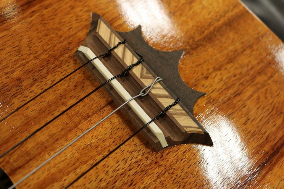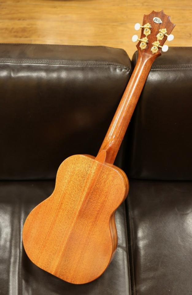 本器は2008年製USED品。テナースタンダードモデル”KTM-00”、目を惹くクラウンブリッジ仕様の希少な1本。ハワイアンコアボディ、マホガニーネック、エボニー指板&ブリッジ、ドット指板インレイ。杢目が良く映える薄めのグロス塗装に、木材の風合いを存分に楽しむことが出来るルックス。クラウン型のヘッド、おむすびをモチーフとしたMUSUBI サウンドホールなど個性溢れるデザインに加えヘッドシェイプと対を成すようにデザインされたクラウン型のブリッジがさらに強い個性を持った印象を受けます。指板のエボニー材に木目のきれいなストライプドエボニーを仕様しながら、ブリッジの装飾に木目を生かした埋木が施されており派手ではないデザインながら実に手の込んだ作りになっています。鳴りの大きいテナーサイズをお探しの方はぜひ一度お手に取ってみていただきたい一本です。