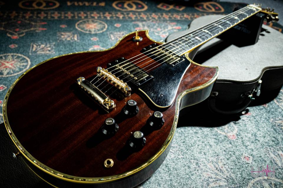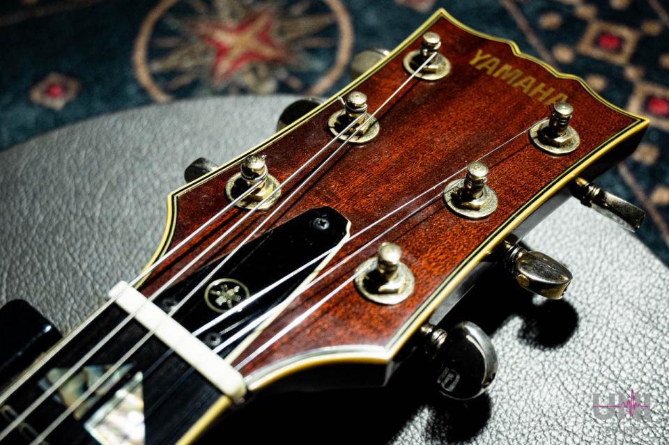 ボディおよびネックにはホンジュラスマホガニーを使用。ボディは当時の70年代Gibsonにも見られるパンケーキ構造で、指板材にはエボニーを採用しています。木材選定からも、当時ヤマハが海外メーカーに匹敵するモデルを本気で目指していたことがうかがえます。ネックシェイプは比較的スリムで、70年代らしい演奏性の高いグリップ感です。