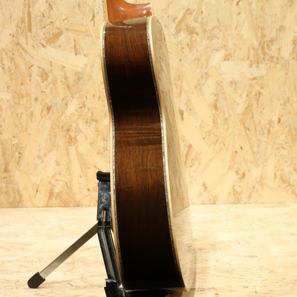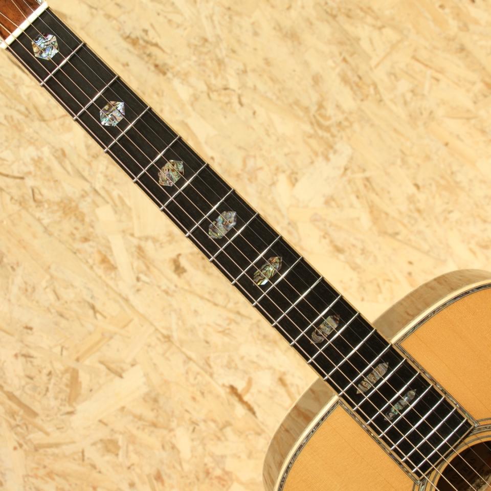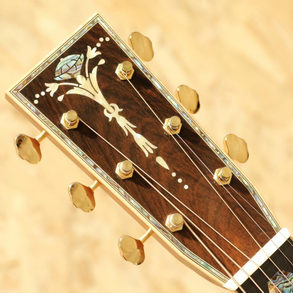 1962年より福岡久留米にてギター製造を行う老舗純国産ギターブランド、アストリアスギター。現在もベテランを中心とした約15名のスタッフで運営しています。本器はECシリーズの最高級モデル”E.C Emperor Jacaranda”。2017年製USED品です。ジャーマンスプルーストップ、ハカランダサイド&バック、マホガニーネック、エボニー指板&ブリッジ、ゴトー製オープンゴールドペグ、ハカランダ天神板、アバロントーチインレイ・ヘキサゴン指板インレイ、アバロンバインディング&ロゼッタ、トーティスピックガード、ノンスキャロップド・エックスブレーシング、オールラッカー仕上げ、後付けにてL.R Baggs Hi-Fi搭載。厳選された最高級材やヘッドの先からボディエンドまで贅沢に施されたメキシコ貝インレイ。経験豊富なアストリアスクラフトマンが時間と手間を惜しまず製作し、エンペラーという名がふさわしいまでの一つの究極形を体現したギターです。均整の取れた杢目のジャーマンスプルース、美しい杢目のハカランダ、そして青々と輝くアバロンのインレイの数々。外観の絢爛さはもちろん、サウンドにも唸るものがあります。重厚な低音域にスッキリと抜けていく上品な高音域。小ぶりがゆえに、音の立ち上がりが早くタッチレスポンスに優れた音色。45mmナット幅、645mmのロングスケール仕様で音の分離も明瞭でフィンガースタイルに最適なギターです。アストリアスらしい繊細で華麗なトーン、弦の輪郭や解像度の高さから細やかなフレーズやニュアンスの表現にも優れています。力強いストロークにもしっかりと対応、サイズ感以上のボリューム、明瞭な音像でぼやけることもなく安定したサウンドをストロークでも奏でます。ピックアップは後付けにてL.R.Baggs HiFiを搭載。2つのセンサーをブリッジプレートに貼り付けるタイプのHiFiはコンタクトピックアップに分類されますが、従来のコンタクトピックアップのサウンドとは異なり、専用の高性能プリアンプとの組み合せで、L.R.Baggsでも屈指のナチュラル・サウンド。バランス、クリア、ダイナミクスを備え、フィードバック耐性も非常に高いのが特長です。全体を通して光にかざせば視認できる程度のキズがある程度と非常に綺麗なコンディションが保たれている本器。プレイ・ネックコンディション共に良好。年間限られた数のみの生産の為、中古市場でも出回りの少ない機種。純国産のハイグレードOMスタイル、お手持ちのギターのグレードアップをご検討中の方は是非お試しください。ヘッド裏2弦と3弦のペグの間に米粒程の凹みキズがあるのが惜しい点。その他は光にかざせば視認できる程度の線キズがある程度と綺麗なコンディションが保たれている本器。ネック周りやフレットのコンディションも良好、演奏性を高く保たれた1本です。ピックアップ搭載でより実戦仕様へと仕上がっている本器。エンペラーは受注生産、特段ハカランダ仕様モデルは玉数が少なく新品をご検討だった方にはとてもお買い得にお求め頂けるお買い得品!お早めにどうぞ。オリジナルハードケース付属致します。
