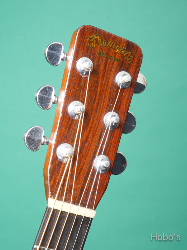 フレット及びサドルの高さにも十分余裕があり、ネックコンディションも良好です。ボディやネック裏には、経年変化による日焼けやウェザーチェックが全体的に年式相応に見られますが、クラックはございません。ピックガードもオリジナルで、マーチンクラックもございません。その他裏板右側に一部塗装が剥がれている箇所がございます。オリジナル・ピックガード、フィンガーボード、フィニッシュ。ハードケースが付属致します。ネックヒールサイドにストラップピン装着跡があり、ブリッジは交換されております。当店工房にてネックリセット済み(それに伴いサドル製作交換済み)。