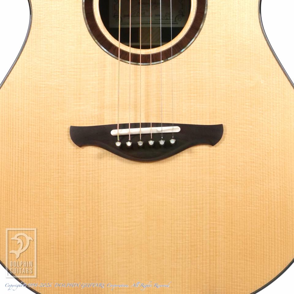 重厚な音響特性を持つホンジュラスローズウッドならではの太く低音の効いたサウンドを放ち、高音弦の華やかな音色に、ストロークでも音潰れせず、サイズ以上のトルクフルな音量、ハイポジションでも音痩せがなく伸びのあるサウンドを奏でます。