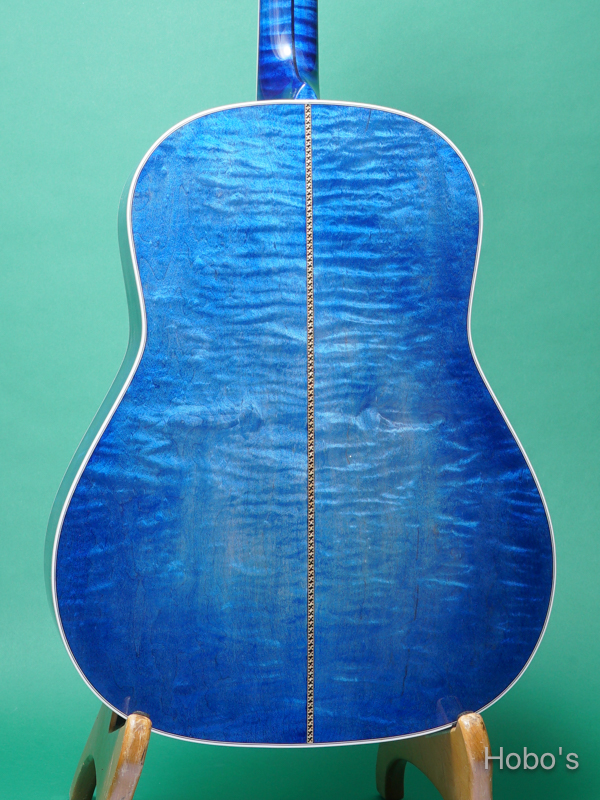 本ギターはアドヴァンスドジャンボを基本にカスタム製作された渾身の手工品で、当店オーダーによるこだわりの逸品です。ラウンドショルダーによるボディーやネックには鮮やかなサファイアブルーを採用し、白蝶貝によるトリムやインレイが施されていることが最大の特徴。杢目の美しいフレイムメイプルやヘッドにとてもよく映えております。表板には熱処理をしたトリファイドアディロンダックスプルースを使用し、更に製作にニカワ接着を採用。一音一音が太くも音抜けがよいことが最大の魅力で、抜群のレスポンスとまとまったコードサウンドが素晴らしく、ロングスケールと相まって、レトロな雰囲気が全面に出た迫力のサウンドに仕上がっております。アルペジオからコードストロークまで、幅広く対応できる弾き語りに最適なギター。その他オリジナルデザインのカスタムインレイも細部に渡り手が込んだ渾身の素晴らしい仕上がりとなっており、見る者弾く者を魅了すること必至。ギブソン出身の名工が贈る最高級手工サウンドの魅力を存分にご堪能して頂けることでしょう。