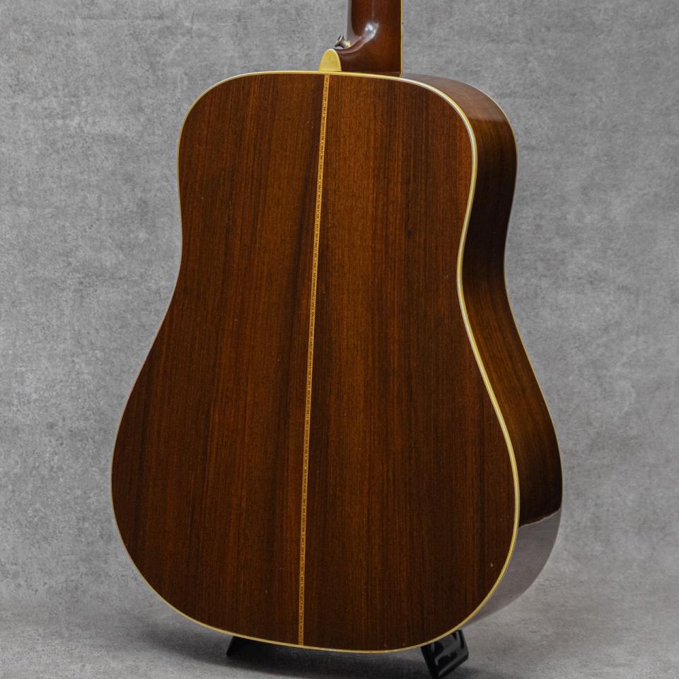 ブックマークする 値下げ通知に登録"D-41"はマーチン社の広報/研究家マイク・ロングワース氏によってデザインされ、1969年に製作が開始されたモデル。数が少なくて高価なD-45を探すよりもD-28に飾りを付けたいという需要から生まれ、28と45の中間モデルとして独自の個性を持ったモデルです。本器は1976年製USED品。弾き込まれグッドサウンドのプレイヤーズギアの1本。スプルーストップ、スプルーストップ、インディアンローズウッドサイド&バック、マホガニーネック、エボニー指板&ブリッジ、アバロンヘキサゴン指板インレイ、グローバー”ミルクボトル"ゴールドペグ、アバロントップトリム&ロゼッタ、モザイクバックストリップ、スクエアネックトラスロッド、ラージローズウッドプレート、ノンスキャロップドXブレイシング。ピックガードは面取りブラックガードに交換されています。芯のある伸びやかで力強いサウンド。”45”とは異なる華やかさをはらみながらも、骨太で漢くさい良い響き。しっかりと弾かれており、角の取れた粒立ちの良い小気味良いグッドサウンドです。使用に伴う補修がいくつか見られます。ヘッド付け根のネックにヒビの補修が見られますが、現状使用に懸念は覚えず軽微なものと思われます。指板バインディングに縮みによるヒビと補修が見られます。ブリッジプレートに弦玉食い込みによる摩耗の補修が見られます。ブリッジ上面が研削により少し薄くなっています。いずれも使用・経年で想像できうる範囲のものばかりで、致命的なものは伺えず、しっかりとお使いいただけるコンディションです。ウェザーチェッキがびっしりと入ったオリジナルフィニッシュは貫禄たっぷり。サウンドホールまわりのピッキングウェアや、幾らかの小傷・打痕は伺えますが、ボディのウッドクラックは見られず良好。ブレイシングもオリジナルのままで当時のサウンドをお楽しみいただけます。ネックリセットが行われており、弾きやすいアクションをしっかりと保っています。ネックヒールにストラップピン増設、過去にピックアップ取付履歴がありエンド部の12mm加工(現在はコンバージョンピンを取付)が見られます。修理履歴や使用感は伺えますが、その分弾き込まれグッドサウンドの本器。ガシガシ弾いていただきたい1本です。ハードケース付属