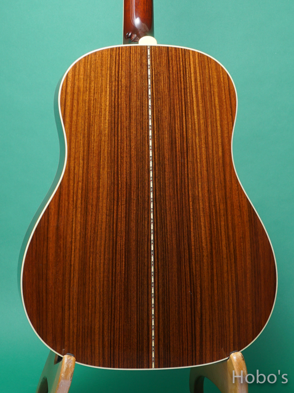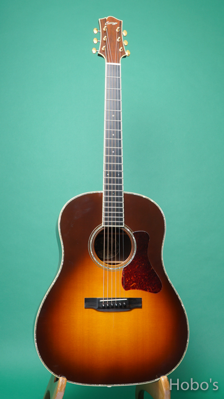 本ギターはラッカー塗装時代にオーダーされたこだわりのカスタムモデルで、とても鳴りの良い逸品です。DシリーズやOMシリーズとは対極にあり人気を博しているCJですが、前者のモデルと比較してもその製作本数の割合は少なく、中古市場において流通が稀なギターと言っても過言ではないでしょう。特に本器はオプションでサンバーストフィニッシュとアバロントリム、並びにゴールド仕様の糸巻きが採用されており、華麗でいてクールな外観美を見事演出していることが最大の特徴と言えるでしょう。一音一音の透明感ときらびやかさ、何よりコードの切れ味が際立ったサウンドに仕上がっており、ドレッドノートスタイルよりも艶がある音色と湧き上がる出音は大変印象的です。その歯切れの良さとパワー感に溢れたはじけるサウンドは、コードストロークは勿論のこと、フィンガープレイにおいてもその力を発揮し、プレイヤーの心の琴線に触れることまさに必至。ギブソンやマーティンギターとは一線を画す最高級カスタムサウンドの魅力を存分にご堪能して頂けることでしょう。