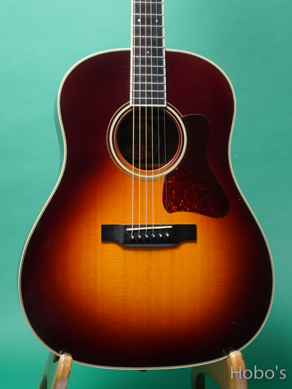 本ギターはアドヴァンスドジャンボをモチーフとしたサンバーストフィニッシュが採用されたカスタムモデルで、素晴らしい鳴りの逸品です。DシリーズやOMシリーズとは対極にあり人気を博しているCJですが、前者のモデルと比較してもその製作本数の割合は少なく、中古市場において流通が稀と言っても過言ではないでしょう。粘りとコシのあるパワー感に溢れたサウンドに仕上がっており、ドレッドノートよりも艶がある音色と太い低音は大変印象的です。歯切れの良さとパワー感に溢れたはじけるサウンドは、ドレッドノート・モデルよりも艶がある音色と太い低音域が秀逸。コードストロークは勿論のこと、フィンガープレイにおいてもその力を発揮し、ギブソンやマーティンギターとは一線を画すハイエンドサウンドの魅力を存分にご堪能して頂けることでしょう。